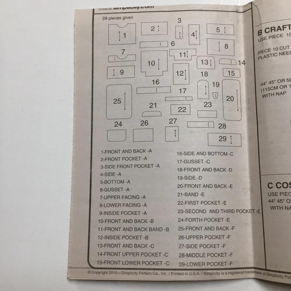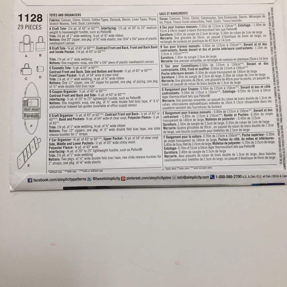 UPC: 039363511281 Cut/Uncut: Cut Age Group: Teen, Adult Gender: Unisex Compatible Size: One Size Country/Region of Manufacture: United States gtin13: 039363511281 Brand: Simplicity Type: Tote Bag, Organizer Bag Seller Notes: “Used - Cut -- all pieces included” MPN: 1128