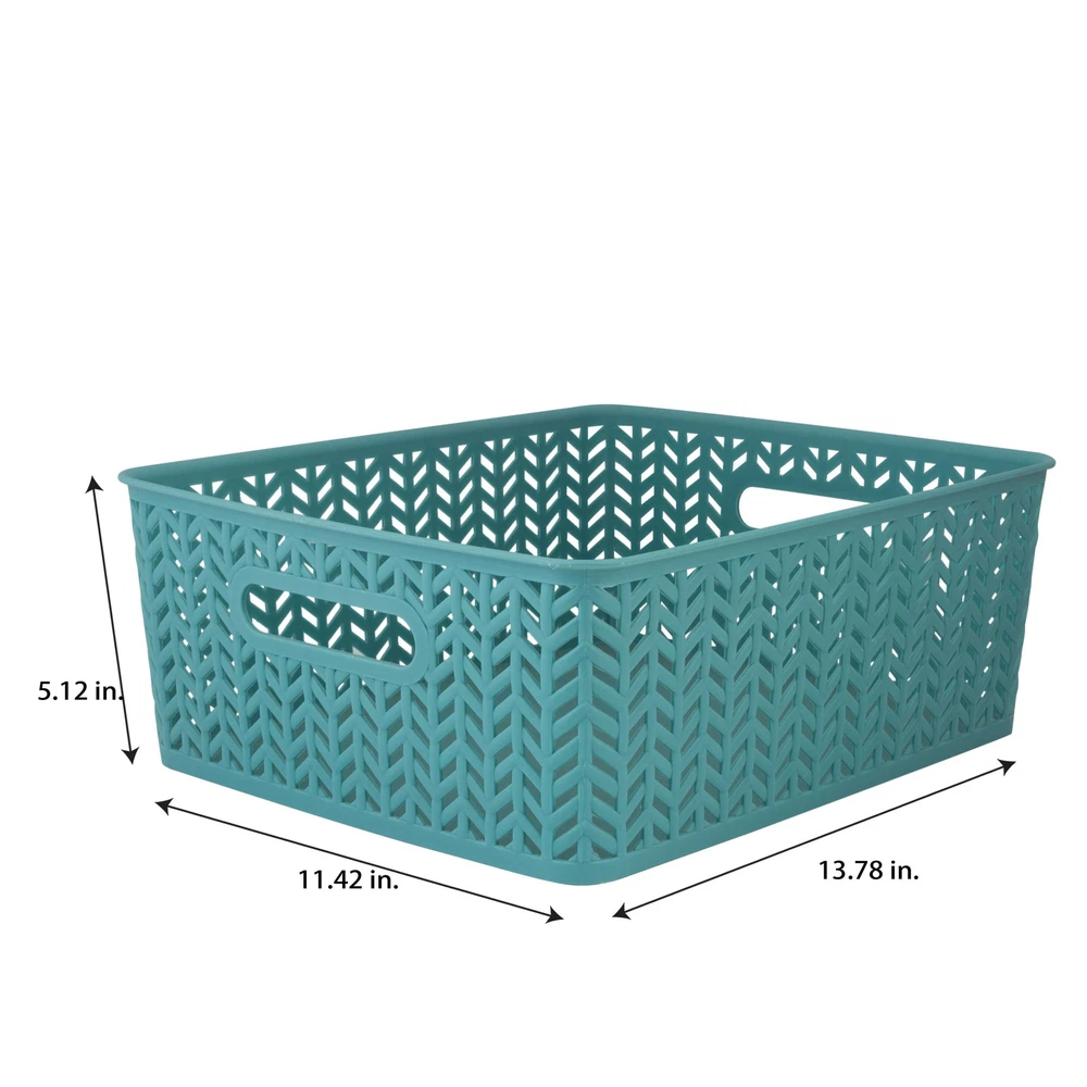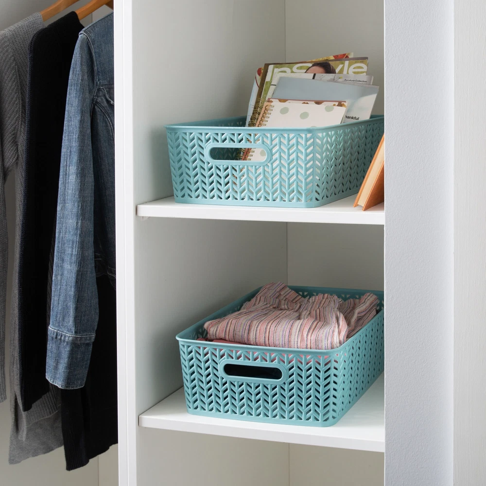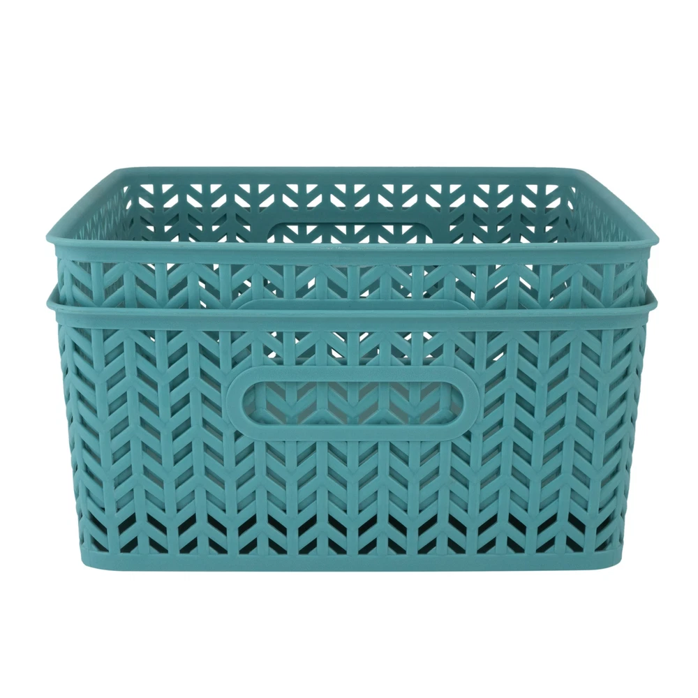 Simplify's Herringbone Storage Bin has a unique wicker design and is made of sturdy polypropylene plastic. 2 sturdy open handles makes it easy to carry Bin around from one place to another. It has a lightweight design and holds a multitude of items, organizing and de-cluttering homes. Wide selection of colors to fit any setting. Free Shipping Over $49.99* Details Simplify 2 Pack Medium Herringbone Storage Basket Product Description: Simplify's Herringbone Storage Bin has a unique wicker design and is made of sturdy polypropylene plastic. 2 sturdy open handles makes it easy to carry Bin around from one place to another. It has a lightweight design and holds a multitude of items, organizing and de-cluttering homes. Wide selection of colors to fit any setting.
