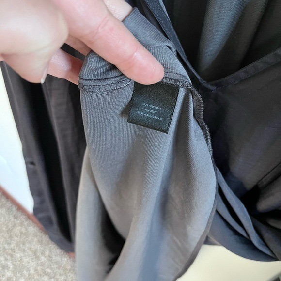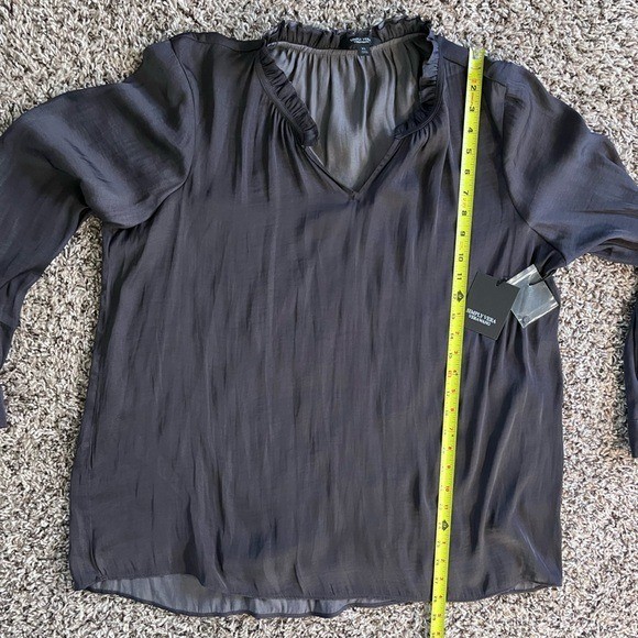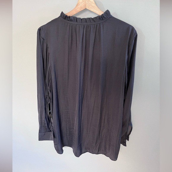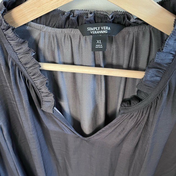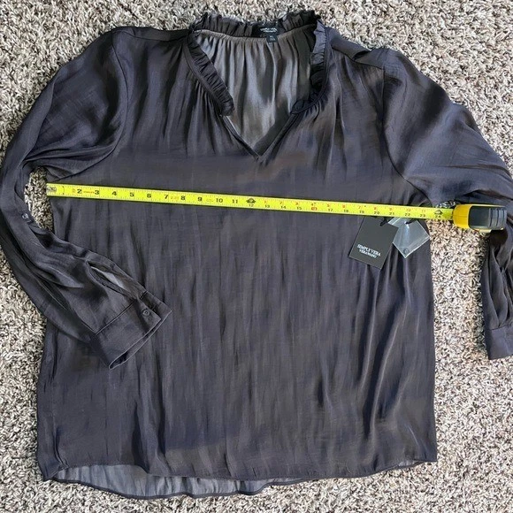 Elegant slate gray V-neck blouse by Simply Vera Vera Wang featuring subtle ruffle trim for a feminine touch. Designed with long sleeves and tab details, this lightweight, drapey top offers a flattering and comfortable fit. Perfect for workwear, layering, or casual chic styling with jeans, trousers, or skirts. A versatile wardrobe staple with effortless polish.