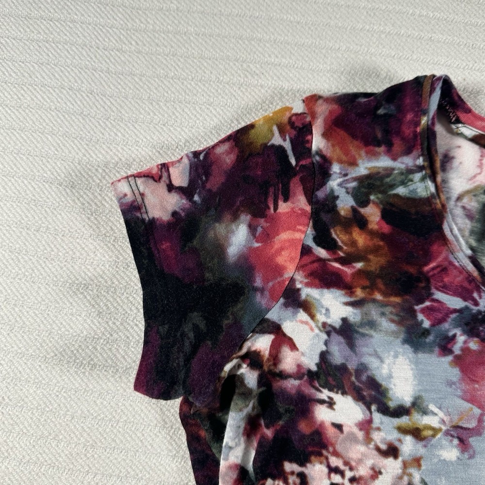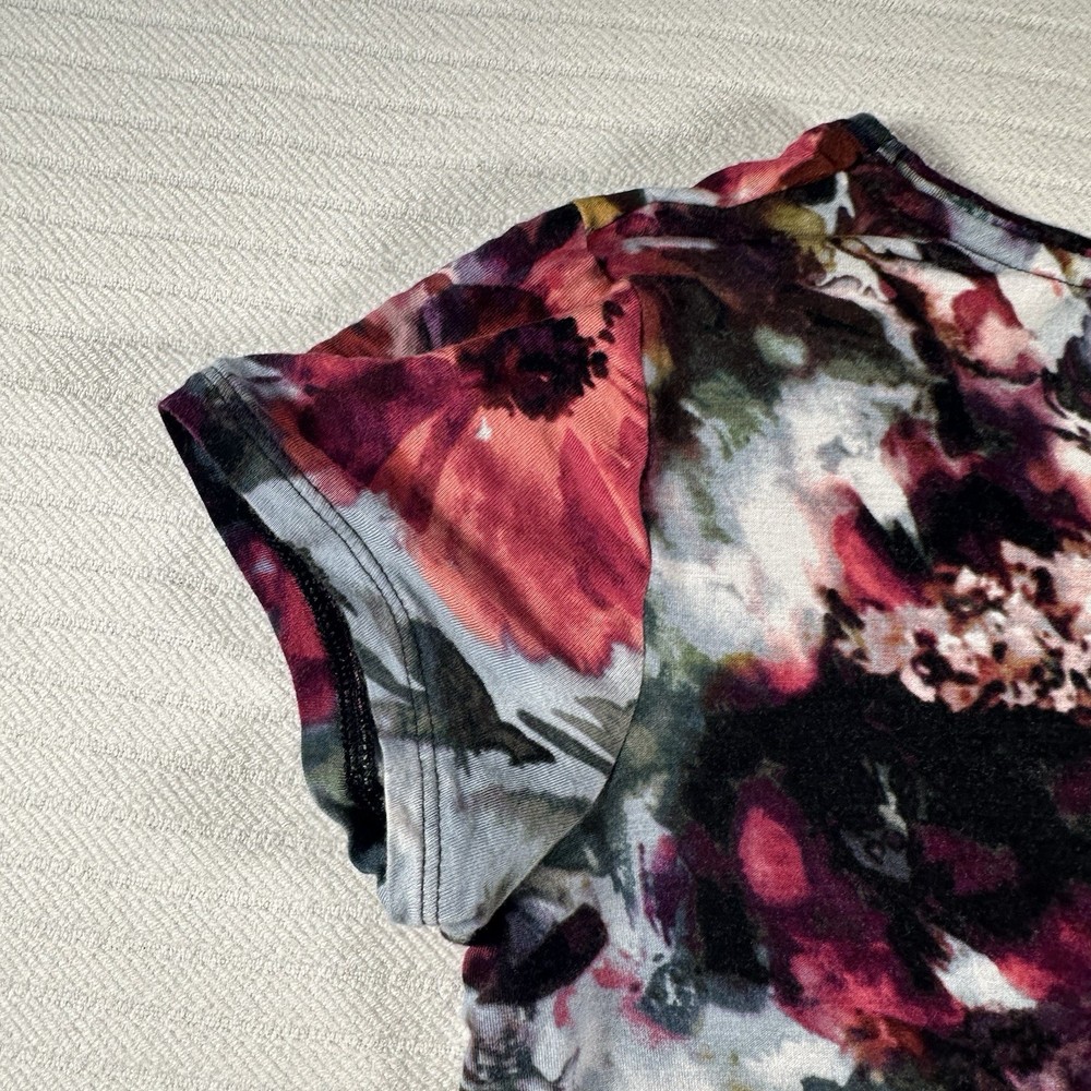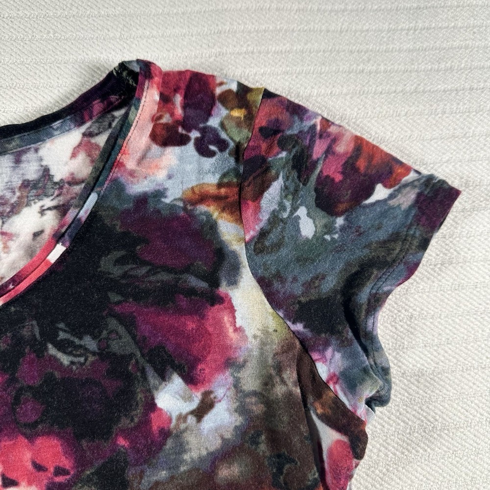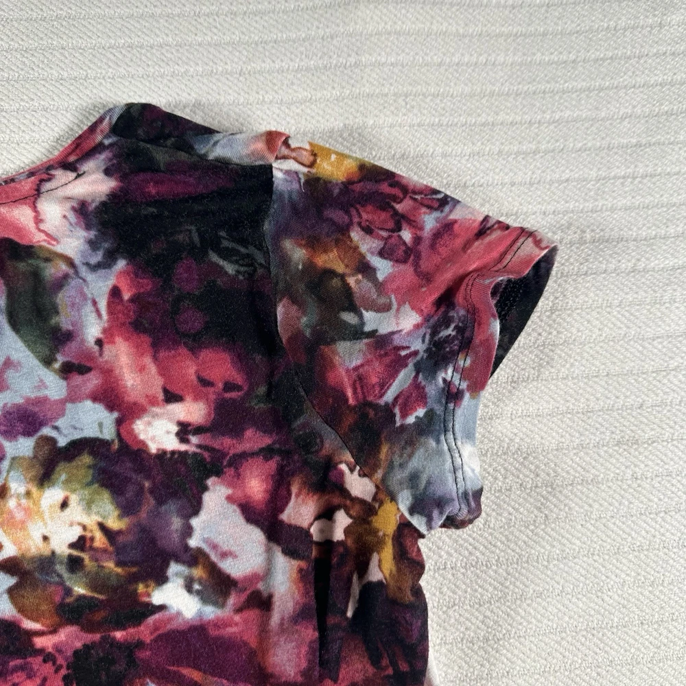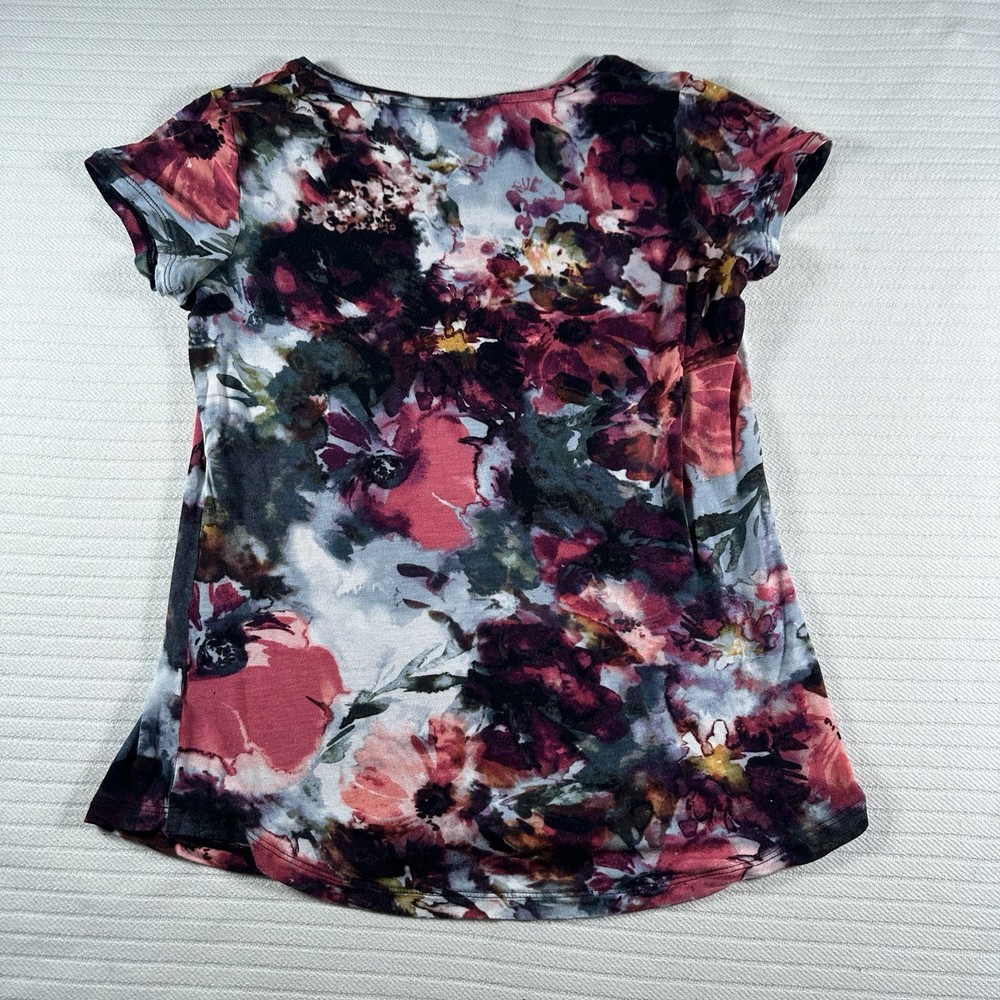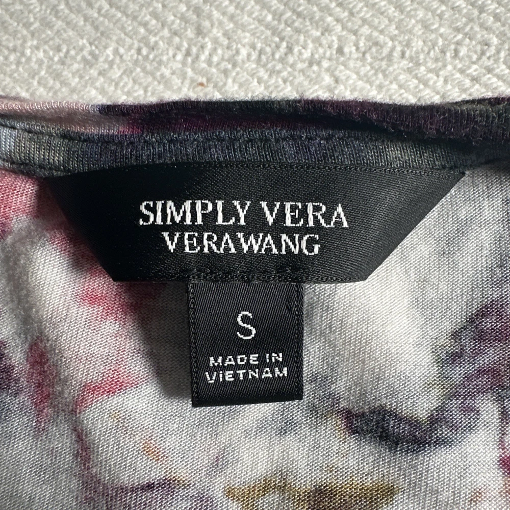 The Simply Vera Vera Wang Women's Small Multicolor Floral Short Sleeve Blouse Top is a stylish and versatile addition to any woman's wardrobe. Made from comfortable rayon fabric, this casual top features a round neckline, pullover closure, and colorful floral pattern. Perfect for the summer, fall, or spring seasons, this basic blouse is easy to wear and perfect for everyday occasions. With a regular fit and strapless design, this top from the Simply Vera Vera Wang brand is a must-have for women looking for a chic and trendy top in a vibrant multicolor design. The pit to pit is 18 inches and the shoulder length down is 24 inches and the sleeve length is 3 inches
