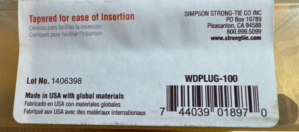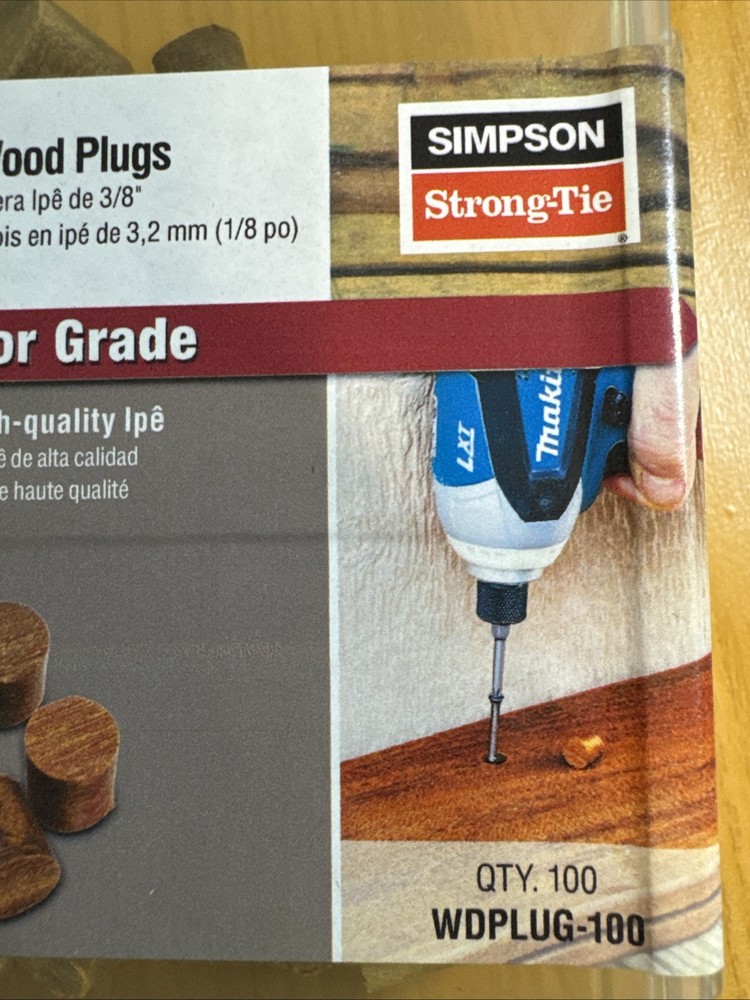 The Simpson Strong Tie 3/8” Tapered Ipe Wood Plugs are a modern and durable option for exterior use. Made by the reputable brand Simpson Strong-Tie in the United States, these plugs come in a quantity of 100. Perfect for various home and garden projects, these tapered wood plugs provide a strong and secure hold for your needs.