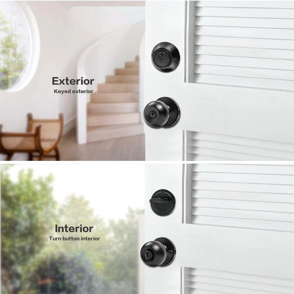 EASY TO INSTALLATION---All you need is a door and a set of tools! One person can complete the installation in 20mins including all accessories. RODUCT INCLUDED---2 sets entry door knob and single cylinder deadbolt.The deadbolt and door knob are keyed outside and with thumb turn button inside.Fitting left or right handed doors. KEYED ALIKE---You can use one key opening all the set of deadbolt and entry lock.The set comes with the same four keys.Keyed alike entry door knob and deadbolt set make life easier. ADJUSTABLE LATCH---Adjustable latch 2-3/8"or 2-3/4"(60mm-70mm); Fit standard door thickness: 1-3/8"to 1-3/4"(35mm- 45mm). DURABILITY---Made from zinc alloy,matte black finished and tested before leaving the factory.Ensure the quality of products. Backed by an Cielsa Dawn 1-year limited .Please us when you encounter problems with our products.