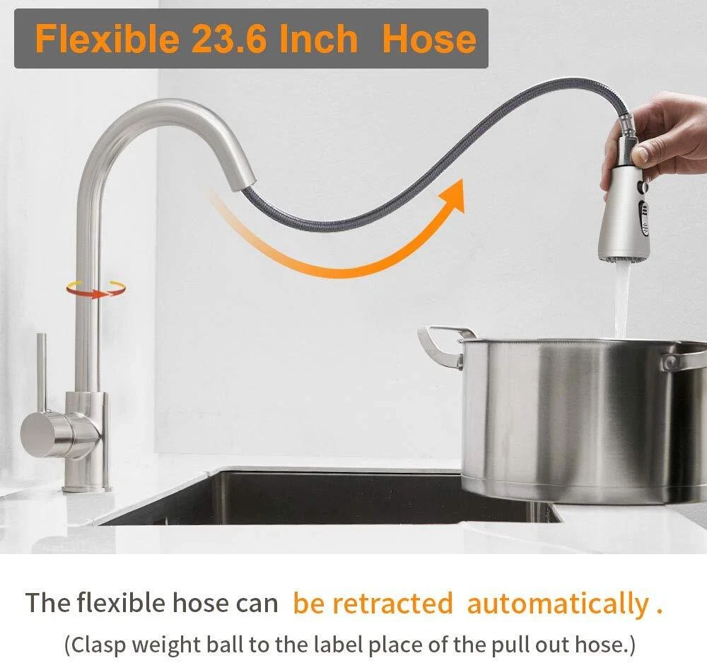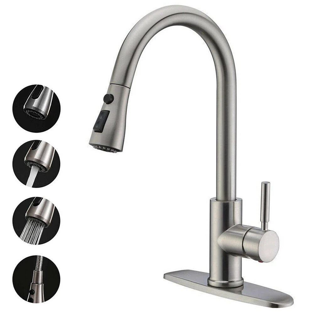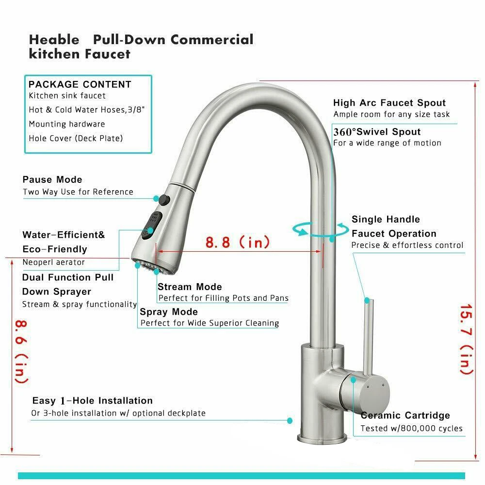 Product Description Function: Kitchen Sink Faucet Feature :Swivel Spout,pull down sprayer Finish: Brushed Nickel Number of Handles: Single Handle Installation Holes: One or Threee Holes Faucet Total Height: As picture shows Valve Type: Ceramic Valve Faucet Body Material: Stainless Steel Faucet Spout Material: ABS Faucet Handle Material: Brass With 2 pipes for cold and hot water(40cm) Water Feature:Mix Hot and Cold Water Pressures:Minimum 0.5 bar, 1.0 bar recommended Water Flow: 1.8 GPM 5 Years warranty Safety first - all bathroom faucet and commercial faucets designed for drinking water use are fully compliant with the latest federal and state lead-free standards Easy to install. Swivel Spout can make the faucet fit for double bowl kitchen sink This is a multi-attribute link, we will ship according to your choice, please choose the option you want before buying! Payment Only PayPal is Accepted. Immediately payment is required after the Winning Bid or Buy it Now Shipping Usually shipment can be arranged within 1 working days after receiving payment. We usually ship by Fedex ,UPS,China Post. Usually the delivery time is 7-20 days. Remote areas will needs extra shipping cost and more time. We ship according to the address on PayPal. (After you make the payment, PayPal will send us an email automatically, informing us the payment and shipping address.) So please make sure your address on PayPal is the right one.We do not ship to PO.BOX address Mail transit time is best estimated, but not guaranteed. As transit time varies. Contact us Shipping damage has to be reported within 7 business days of which the product was delivered. If you have any questions, please be free to contact with us by eBay massage,we will answer your questions ASAP. Feedback I describe items as well as I can. If I have missed something, please let me know. Please e-mail me before leaving feedback if you are unhappy with your item, so we can work it out. International Buyers – Please Note: Import duties, taxes, and charges are not included in the item price or shipping cost. On Jun-05-21 at 02:34:11 PDT, seller added the following information: ????? We hope our products and our service can give you a wonderful experience ?????
