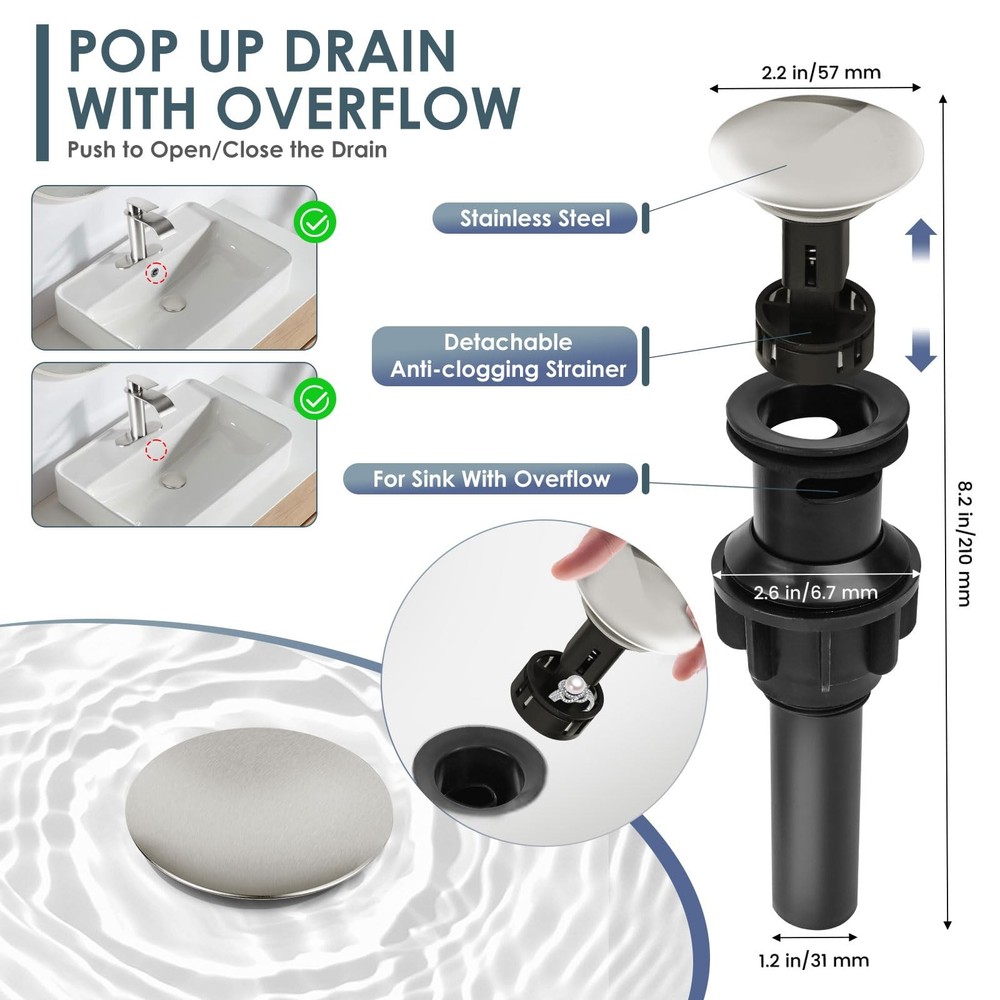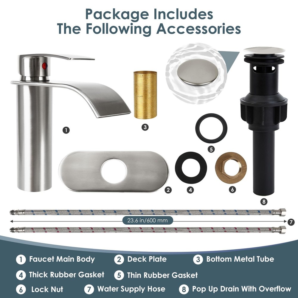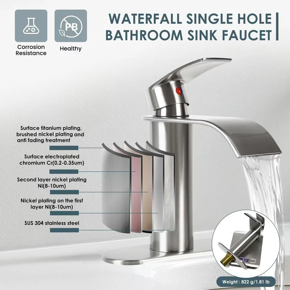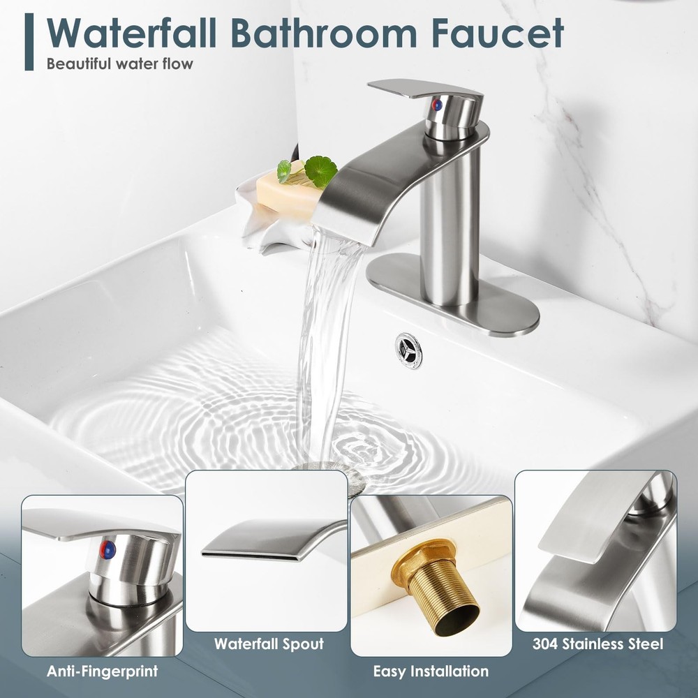This elegant single-handle waterfall spout bathroom sink faucet from provides a stylish addition to any vanity. Featuring a 4-inch centerset design, its streamlined silhouette is a modern take on traditional plumbing fixtures. Smooth operation allows you to control temperature and flow with a single lever. The high arching spout creates a gentle waterfall effect that reduces splashing while filling sinks and basins. Made of 304 stainless steel construction with brass waterway & durable ceramic disc cartridges, it promises long-lasting performance you can count on. Easy installation options fit one or three hole (4 inch) configurations. Finished in spot-resistant electroplated, this lavatory faucet is a low maintenance choice that keeps your bathroom looking new for years to come. ELEGANT STYLING: This single handle waterfall spout faucet features a sleek electroplate finish and minimalist design that enhances any scenes, such as bathroom sink, bar sink, vanity sink, lavatory sink, restroom sink. SINGLE HANDLE CONTROL: Our faucet adopt single lever handle, which can help our users easily adjust to the appropriate water flow and temperature. WATERFALL SPOUT DESIGN & WATER-SAVING: Streamlined waterfall spout which help you create a quiet bathroom environment. With exquisite workmanship, our bathroom waterfall faucet running with no splash, and thus saves water usage. PREMIUM MATERIAL: Constructed of lead-free 304 stainless steel & brass that has undergone rigorous testing for durability and compliance with US plumbing standards. EASY INSTALLATION: Our faucet including all mounting accessories (Pop up drain included), meanwhile, we prepare 6.3 inch deck plate which compatible with 1 or 3 hole (4 inch spread) sink , just bring your own wrench DIY with 30 minutes, without plumbing experience required.