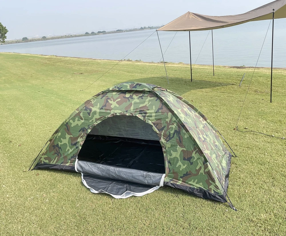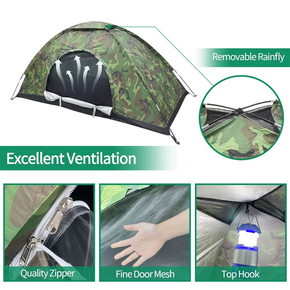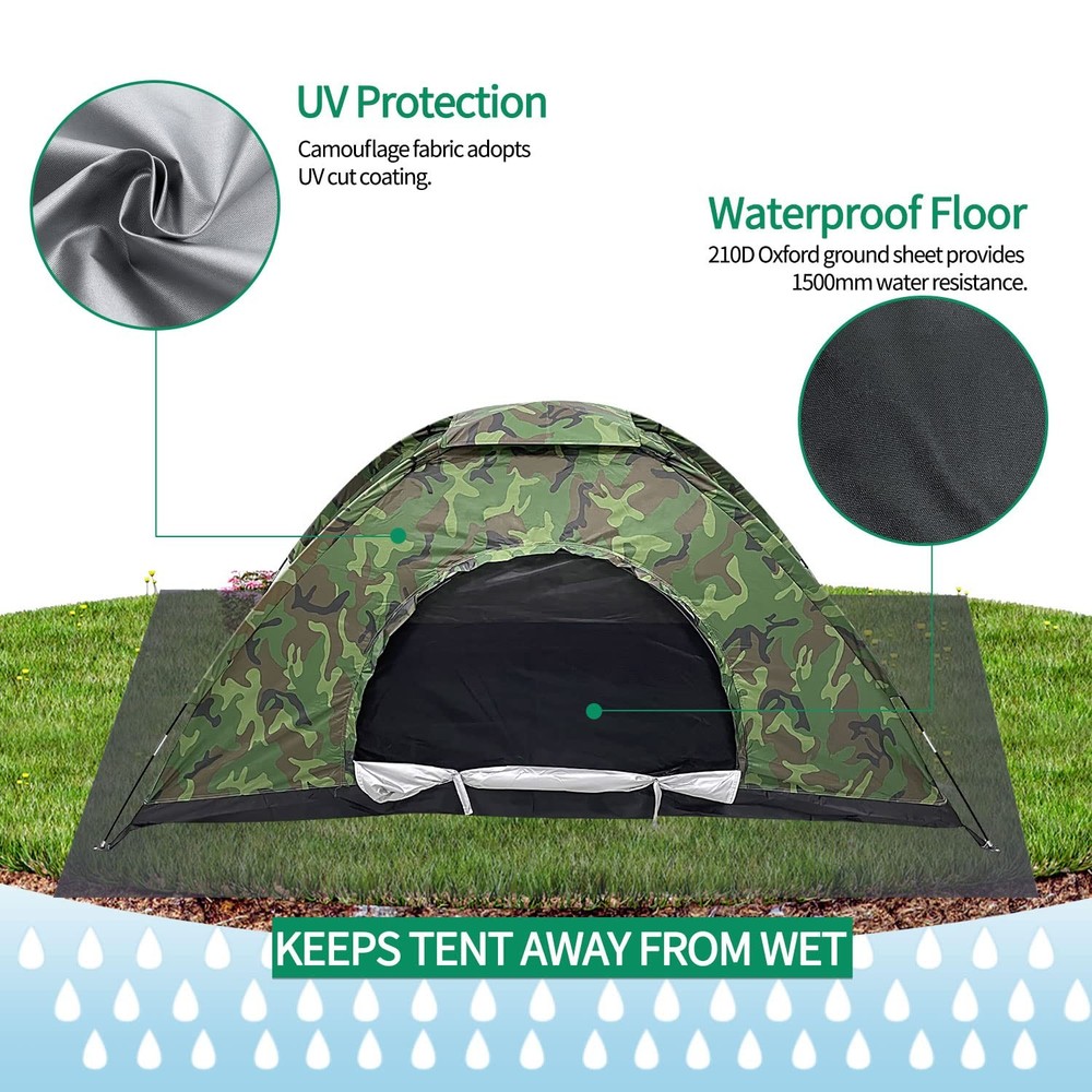 We heared your voice! Upgraded Tent - material, size, durability, and function have been improved! [Material]: Bottom sheet is made of 210D nylon fabric, water pressure resistant up to 5FT. Camouflage fabric is made of 210T Oxford. [Large Space]: Much More Space! Single Tent Size: 82.6"L x 35.4" W x 39.3" H / 210cm L x 90cm W x 100cmH. Double Tent Size: 82.6" L x 55" W x 41.3" H / 210cm L x 140cm W x 105cm H [Function]: Added top hanging hook is convenient for hanging lantern. Stronger nylon mesh is used for the entrance and ceiling, with excellent ventilation. [Portability]: Single tent weighs approx. 3lbs, Double tent weighs ~4lbs. Easy to install and carry. Can fit into your backpack. Perfect for backpacking, camping, bicycle & motorcycle touring, musical festivals, beaches, mountain climbing and other outdoor activities. Please feel free to contact us if you are not happy with the tent, we will provide you a satisfied solution.