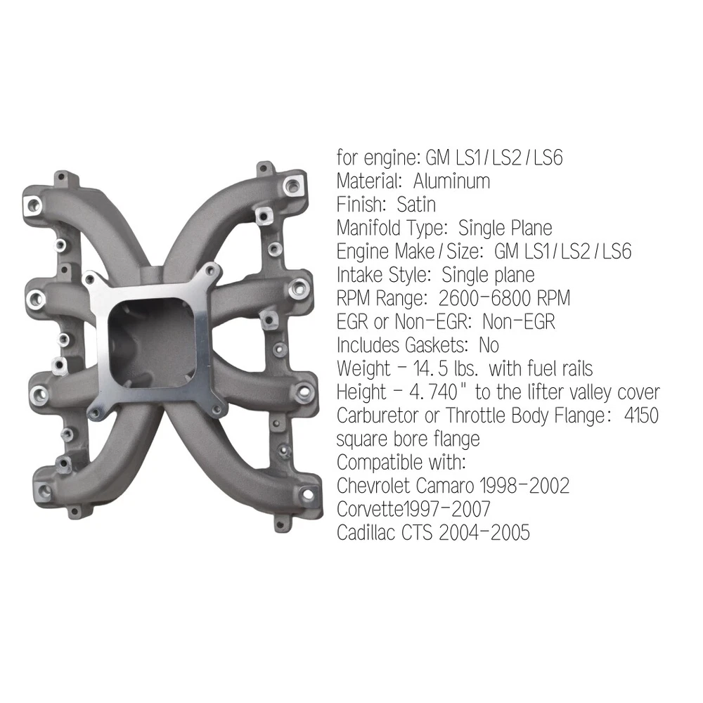 Single Plane EFI Intake Manifold Cathedral Port for GM LS1 LS2 LS6 300-137 Features: Product Type: Intake Manifold Material: Aluminum Finish: Satin Manifold Type: Single Plane Engine Make/Size: GM LS1/LS2/LS6 Intake Style: Single plane RPM Range: 2600-6800 RPM EGR or Non-EGR: Non-EGR Material: Aluminum Finish: satin Includes Gaskets: No Height - 4.740" to the lifter valley cover Carburetor or Throttle Body Flange:4150 square bore flange Fitment: GM LS1/LS2/LS6 Note: 100% brand new, Never been tried or installed. No instructions are supplied.Please consult with a qualified mechanic before attempting installation! Package included: 1*Intake Manifold Mounting Hardware As shown in the picture above