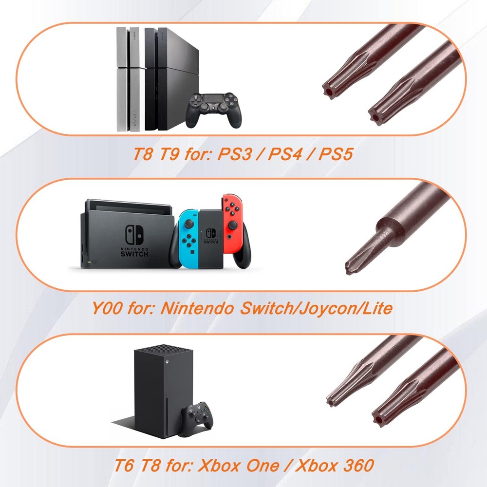 The screwdriver set is a really good helper for life and work. 【Applications】 -- The kit includes a torx T8 security screwdriver and a double-end crowbar. The torx T8 screwdriver can be used for PS3, PS4, PS5 consoles and controllers, Xbox one,Xbox 360 controllers, macbooks, laptops and other devices. The double-end crowbar is used for opening the screen and back cover of electronic devices. 【Magnetic S2 steel screw head】-- All our screwdrivers are magnetically designed, which can fix small screws to avoid falling. screwdrivers are made of high-quality S2 steel, after heat treatment, it is more accurate and durable than silver CRV bits. 【Slip-resistant rotatable handle】-- The screwdriver handle is made of TPR and PP materials, with a special non-slip design, offering a sense of comfortable. The top of the handle is 360°rotatable design which makes it more convenient to remove the screws. 【Portablity】-- The screwdriver and a double-end crowbar are placed in the small package bag, which is convenient for carrying and store. It is also convenient for you to take out the screwdriver for maintenance. 【Attention】--The kit is user-friendly, please make sure what kind of screwdriver you need.