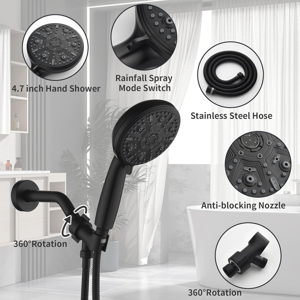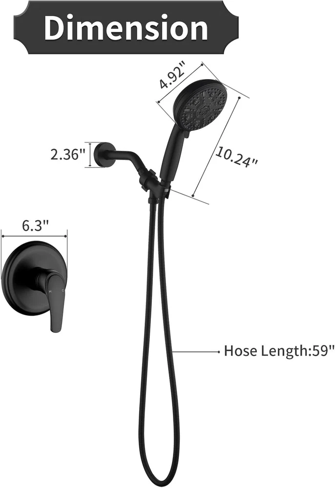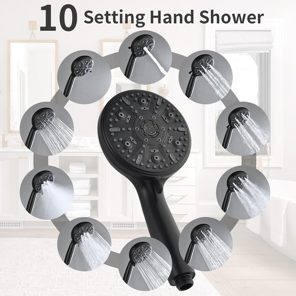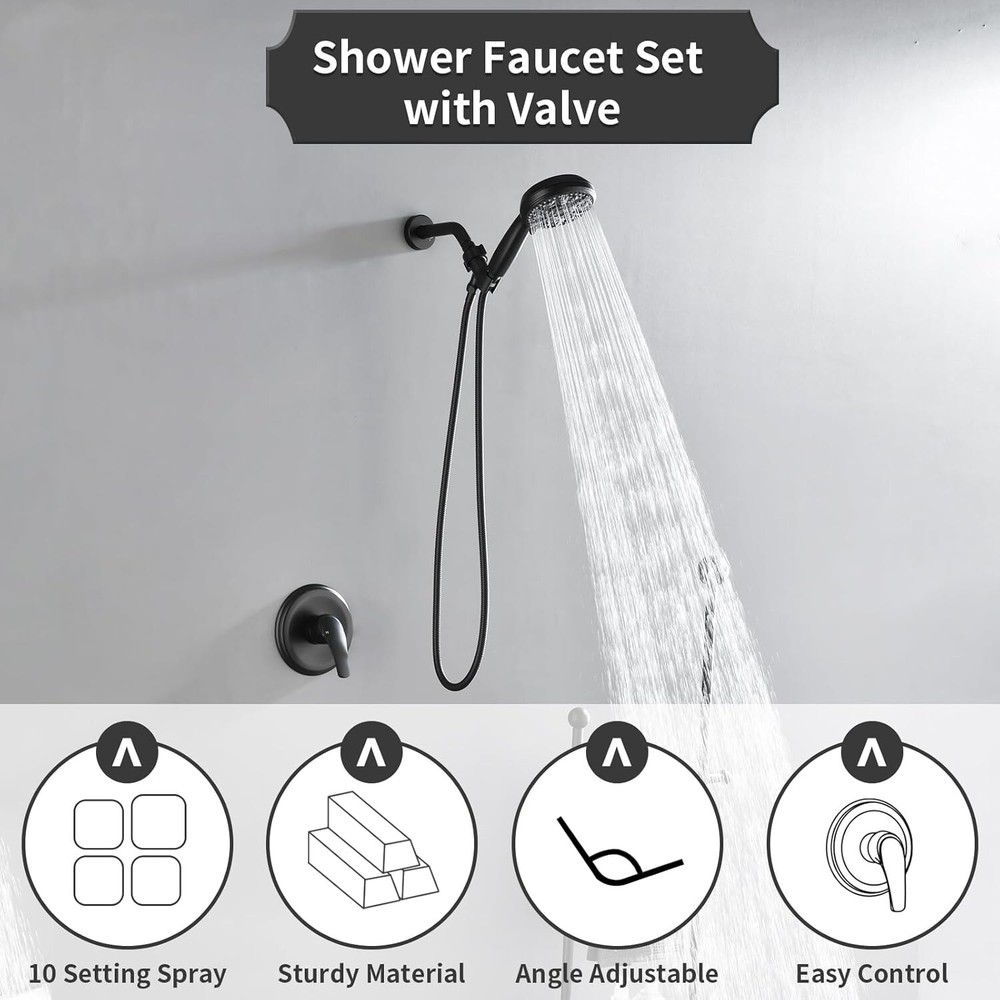 ➤【10 Modes Handheld Shower】- Black shower head and handle set has 10 water spray modes. It can be easily switched between by rotating the handle on the shower panel to suit your needs. The hand shower and the fixed shower can be used together or separately. ➤【Premium Quality】- The main body of matte black shower fixtures is made of high quality copper, sturdy and durable. The finish is colorfast, fingerprint resistant, rust resistant and corrosion resistant. Matte black shower faucet has a simple design that can match any style. ➤[Practical Design] - Single Handle Shower Faucet can be adjusted to the angle according to the needs of family members, so that you have a pleasant bathing experience! IMPORTANT WARNING:Not compatible with other brand valve and cartridges.The old shower valve must be removed if install this. ➤【Prevent Water Hammer】- Single Handle Shower Trim Kit has an internal shut-off valve that allows for a quiet and comfortable bathing environment. The pressure balancing valve offer you to have a suitable temperature without the risk of burns or cold shocks. Bring happiness to your home with the Shower Faucet Set with 10 Functions Handheld!