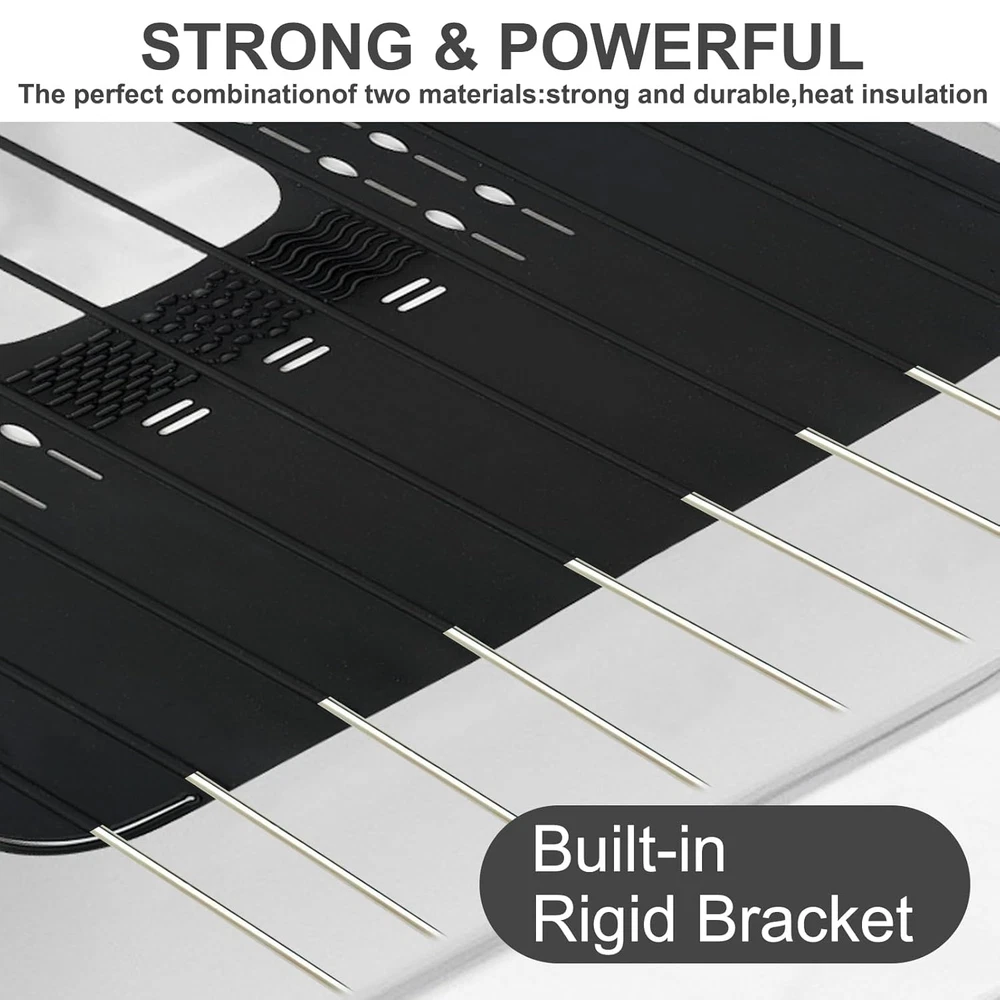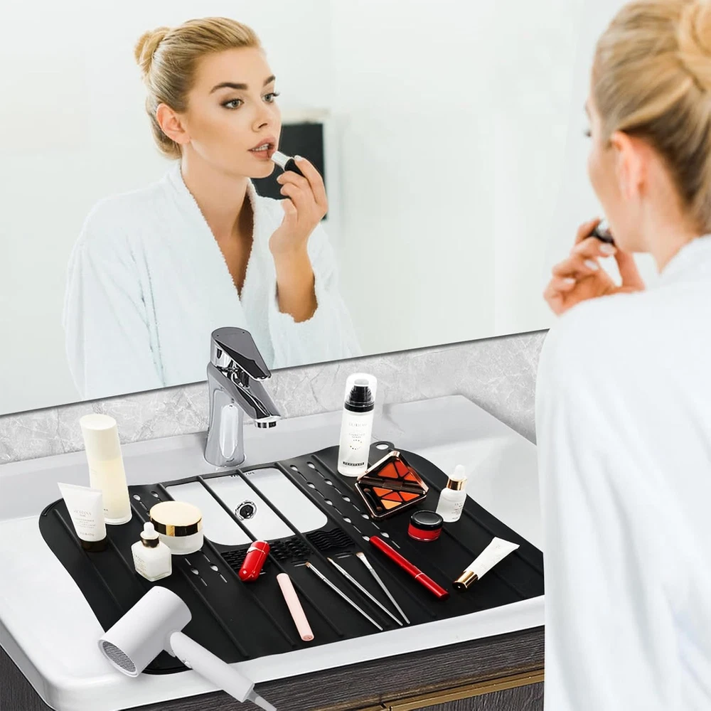 Perfect Size: 21.25'' x 16.14'' the sink foldable cover fits most sinks. It has a unique look and specifically for sinks. The steel frame link is used in the middle, which is strong and durable. Features a scroll design that can be hung for easy storage Heat Resistant: The sinks silicone cover is made of heat-resistant silicone rubber, which can withstand temperatures up to 480°F Bathroom, protecting your sink from heat damage caused by styling tools. It gives you a lot more space Efficient Cleaning Surface: This sink bathroom cover comes with a textured surface designed for cleaning makeup brushes. It makes your beauty routine easier, and cleaning is a snap, just use soap and water. It is easy to clean and has a cutout for storage Keep It Tidy: The sinks bathroom cover for counter space sturdy enough to hold all your individual pieces or hair dryer and brushes. The provided cut out hole still allows access to the faucet should you need water. Cleans very easily Easy to Storage: If your bathroom is very small and has no counter space so this sink bathroom cover works really well. You can roll it up and put it away. It wipes easily and rolls up well Product Description