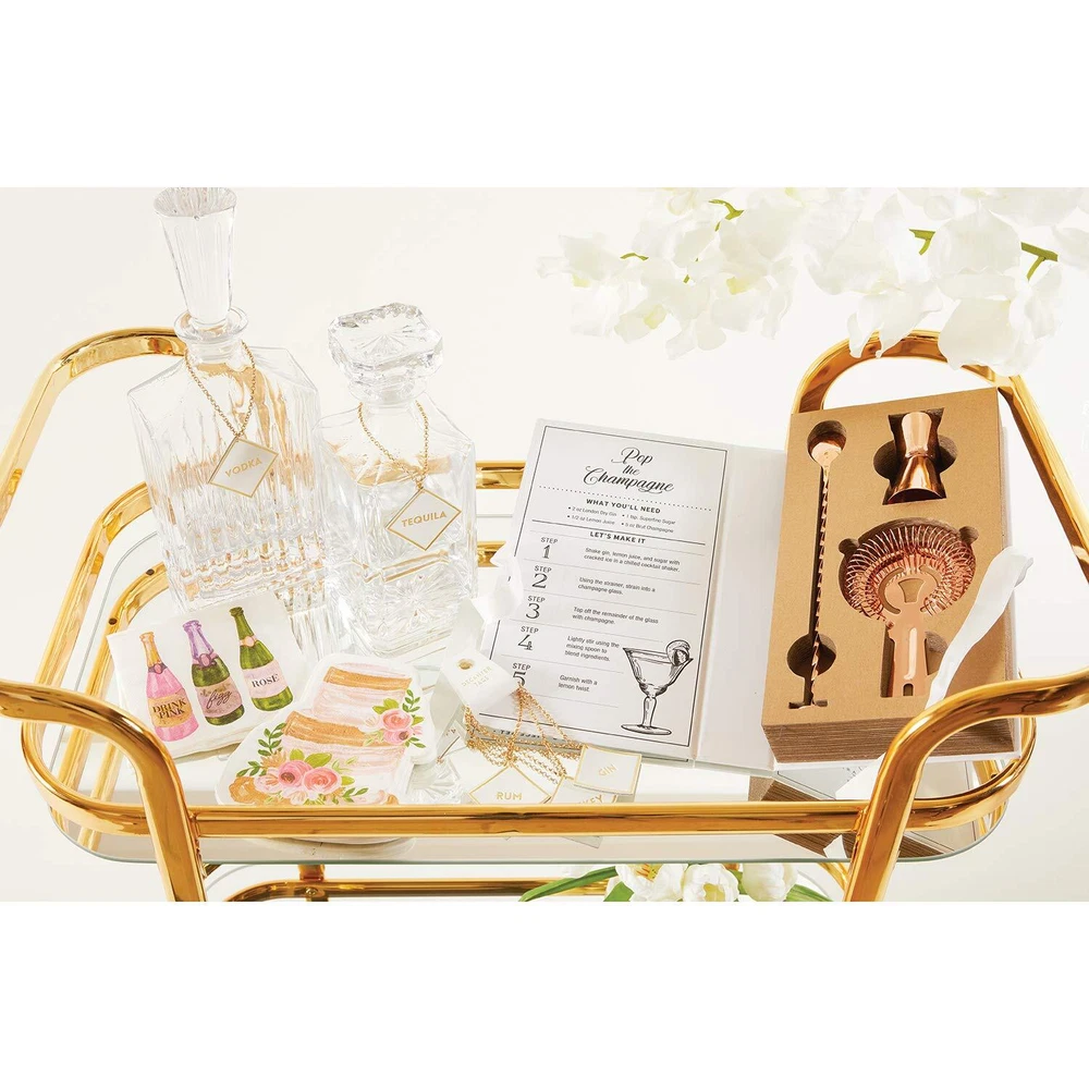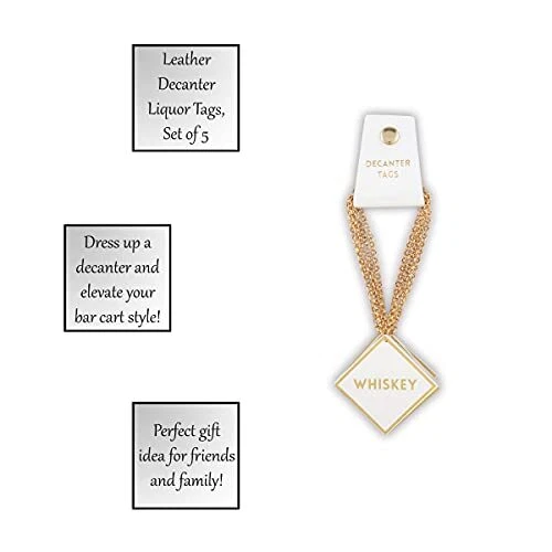 Style your bar cart and dress up a decanter with these leather tags. each of Gin, Rum, Tequila, Whiskey, and Vodka. The perfect gift awaits! To put it simply, at they make what they love and they love what they make. Since 1976, it has been their mission to create beautifully designed, high-quality giftware products that you are inspired to give and want to keep. Their passion for finding the next wonderful product has translated into a broad line drawn from the works of the most talented and trendsetting designers. Browse them all by searching for products from . SET OF 5 WHITE LEATHER BOTTLE TAGS with gold foil stamping and gold metal chains; dress up a decanter and elevate your bar cart style DIMENSIONS: Each bottle LABEL measures 2 x 2-inches 5 DIFFERENT LABELS: each of Gin, Rum, Tequila, Whiskey, and Vodka SEARCH FOR SIPPIN' PRETTY DRINKWARE AND BAR ACCESSORIES to pair with coordinating items to complete your bar set up or to give as a gift : Has been offering quality-made, designer home décor and gifts since 1976