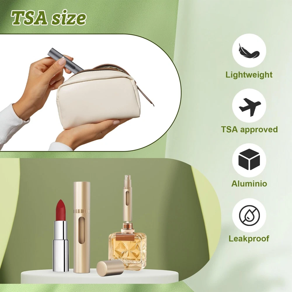 SixTmoon Perfume Atomizer Bottle, Portable Refillable Perfume Bottle Sprayer Leakproof, Travel Mini Size Cologne Sprayer for Men Women, 8ml (Black & Gold) Product Details Color: Black & Gold Brand: SixTmoon MPN: G008 UPC: Does not apply EAN: Does not apply Brand: SixTmoon Color: Black & Gold Material: Metal Capacity: 8 Milliliters Recommended Uses For Product: Women Health,Men,Perfume Brand: SixTmoon Color: Black & Gold Material: Metal Capacity: 8 Milliliters Recommended Uses For Product: Women Health,Men,Perfume Number of Items: 2 Product Dimensions: 3.5"W x 0.7"H Special Feature: refillable, leak_proof, lightweight Item Weight: 0.06 Kilograms Included Components: Adapters Product Care Instructions: Hand Wash Only Reusability: Reusable Manufacturer: SixTmoon Part Number: G008 Item Weight: 2.08 ounces Country of Origin: China Item model number: G008 Special Features: refillable, leak_proof, lightweight Batteries Included?: No Batteries Required?: No Date First Available: August 12, 2021 [UPGRADE REFILL DESIGN & VISIBLE WINDOW] - Easier to refill, this 8ml perfume atomizer uses the exclusive UPGRADE REFILL technology (Pump to fill from the bottom directly, no need to detach the cap). Built with a visible window, you can tell how much perfume left easily. [ MULTI-FUNCTIONAL] - Our refillable travel perfume bottle is perfect for you to carry essential oils, perfumes and fragrances, facial and body mists, and various water-based liquids, essences, toners, rosewater other liquid spray mist shape water etc in traveling and outing. TSA approved for carry on baggage. [ LEAK PROOF & REFILLABLE ] - Made of glass inner bottle and aluminum outer shell, these refillable perfume atomiser is tough and not easy to break, make your luxury perfume always stay safe & same. Pure CNC Copper Valve at the bottom makes sure NO Leaking. [ EASY TO CARRY ] - Lightweight, like lipsticks size, the perfume bottle is perfect to keep in your purse or luggage in work, travel or party. 8ml can spray over 75 times, last for 10-15 days. The spray nozzle is easy to squeeze without fatigue, offer fine atomization, even and smooth, save 40% perfume. Let you always look and smell best. [IDEAL GIFT] - Ideal gift for family and friend on Birthday, Christmas, Anniversary, Mothers Day, Fathers Day, Valentines Day and so on. Your travel companion for business travel, short trip or for daily use. [ 24/7 CUSTOMER SERVICE ] - We offer one-year warranty on travel perfume atomizer. If you receive damaged item, please contact us first because our after-sales team provide 24/7 customer service to give you a satisfied solution.