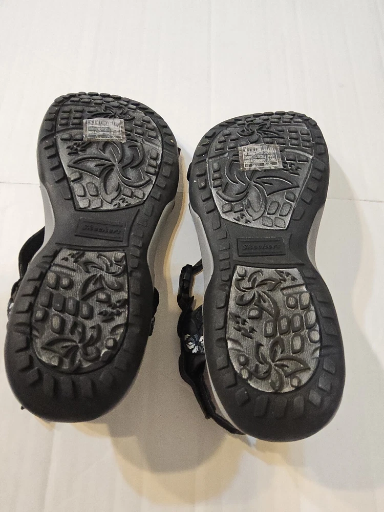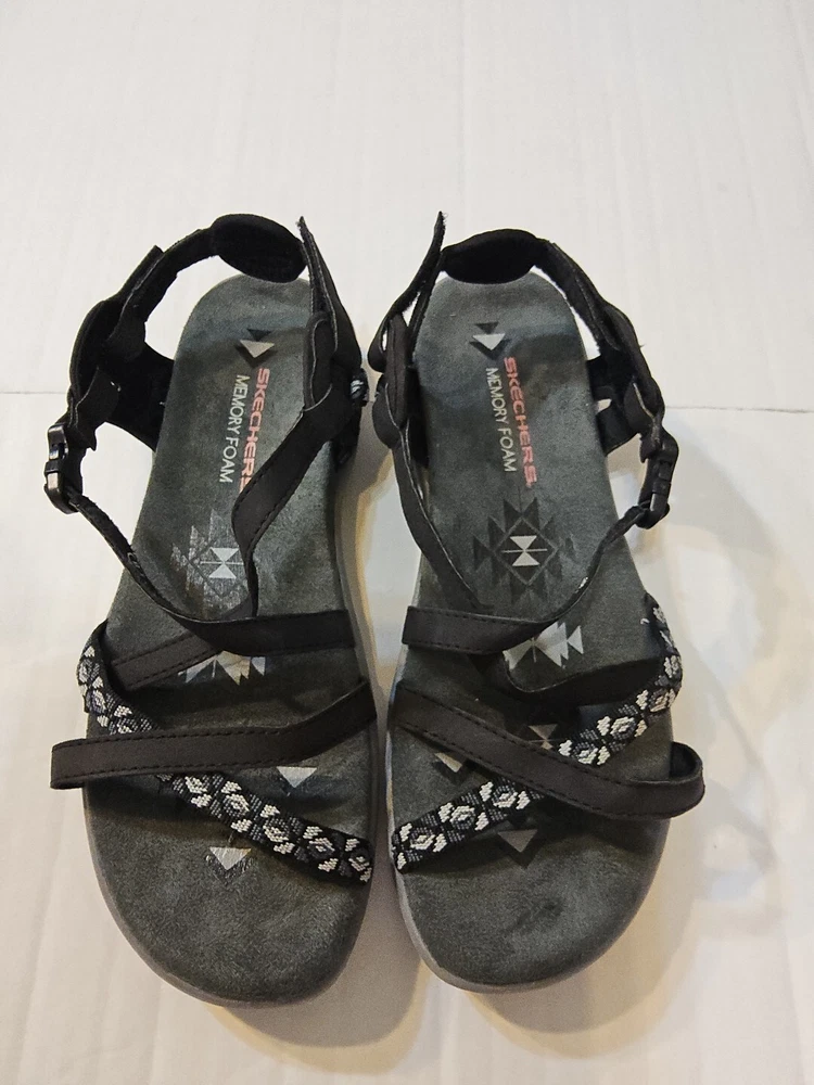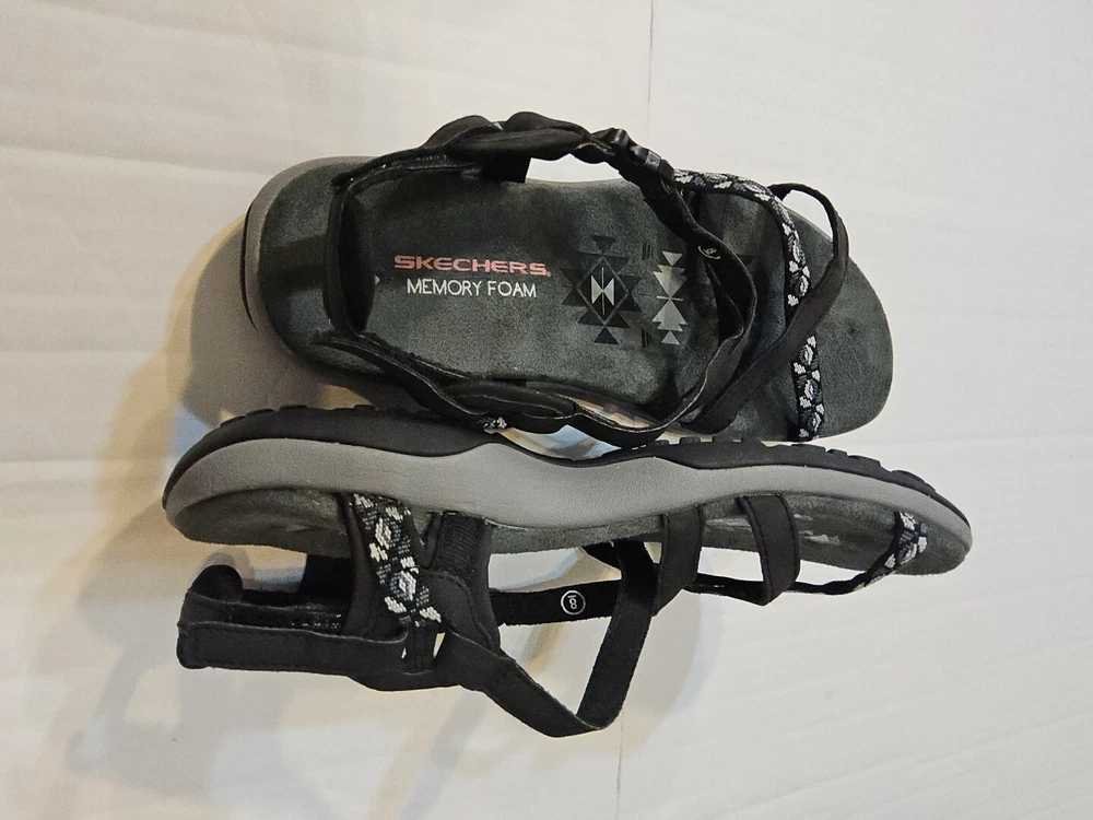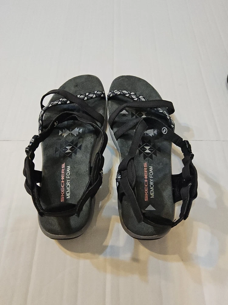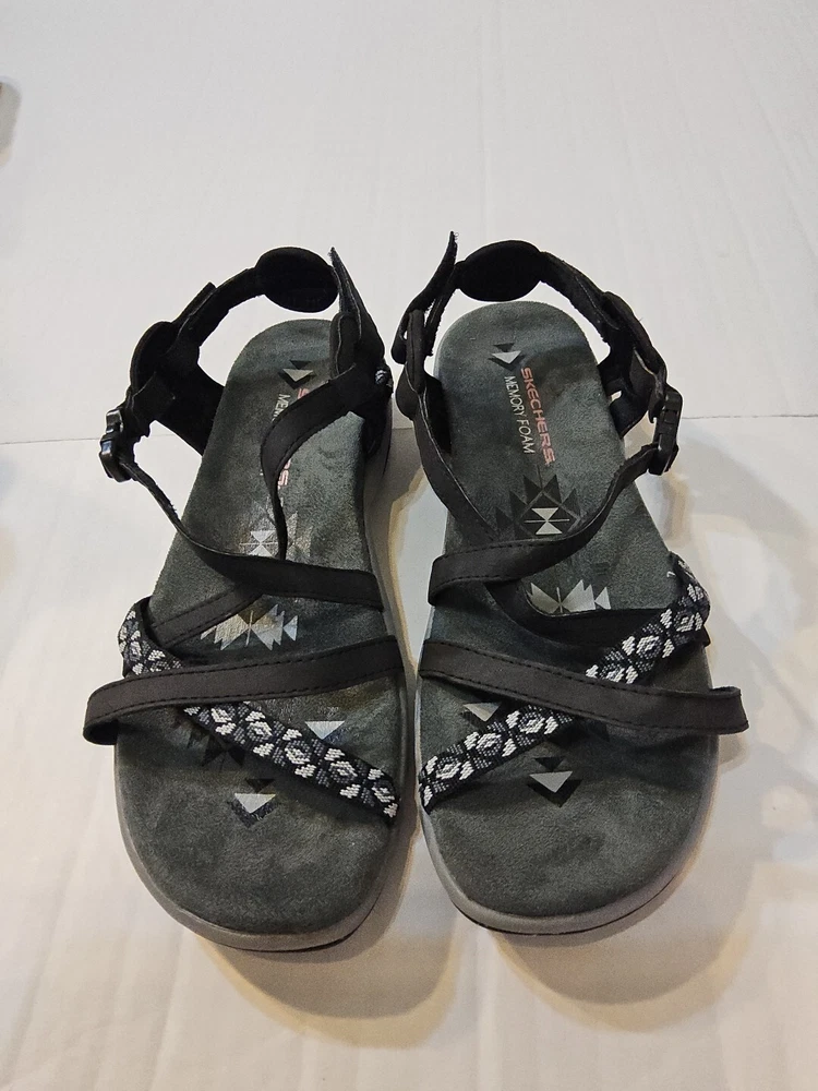 Elevate your outdoor adventures with these Skecher Reggae sandals. Designed with comfort and style in mind, these strappy sandals feature an adjustable buckle closure and low block heel. The synthetic upper material and foam insole provide all-day comfort, making them perfect for any outdoor activity. These black sandals are perfect for any woman who loves the outdoors and wants to look good while doing it. Whether you're hiking, camping, or just exploring the great outdoors, these Skecher sandals are the perfect addition to your wardrobe. Get your pair today and experience the comfort and style that only Skecher can provide. Used