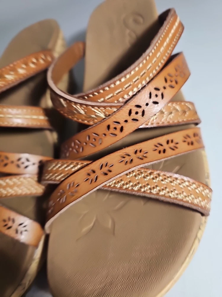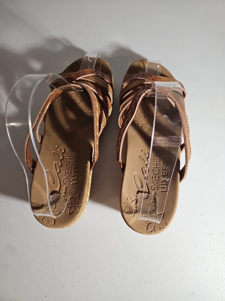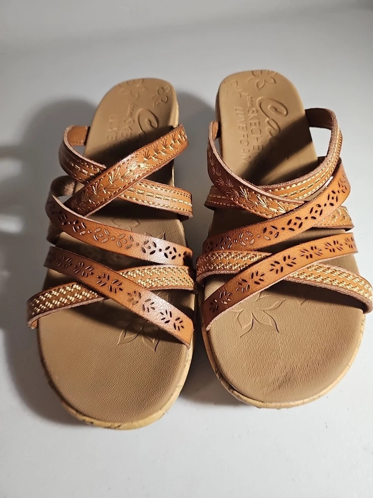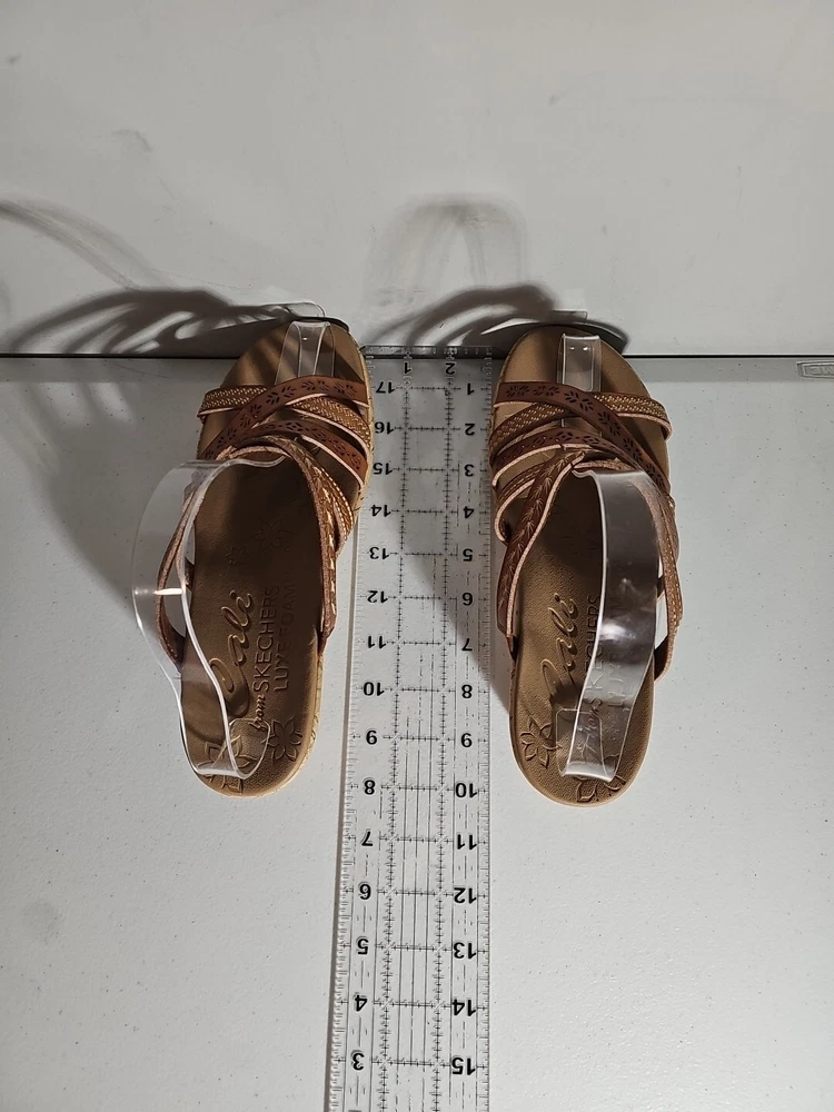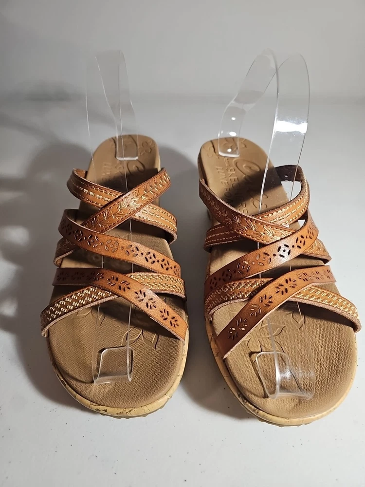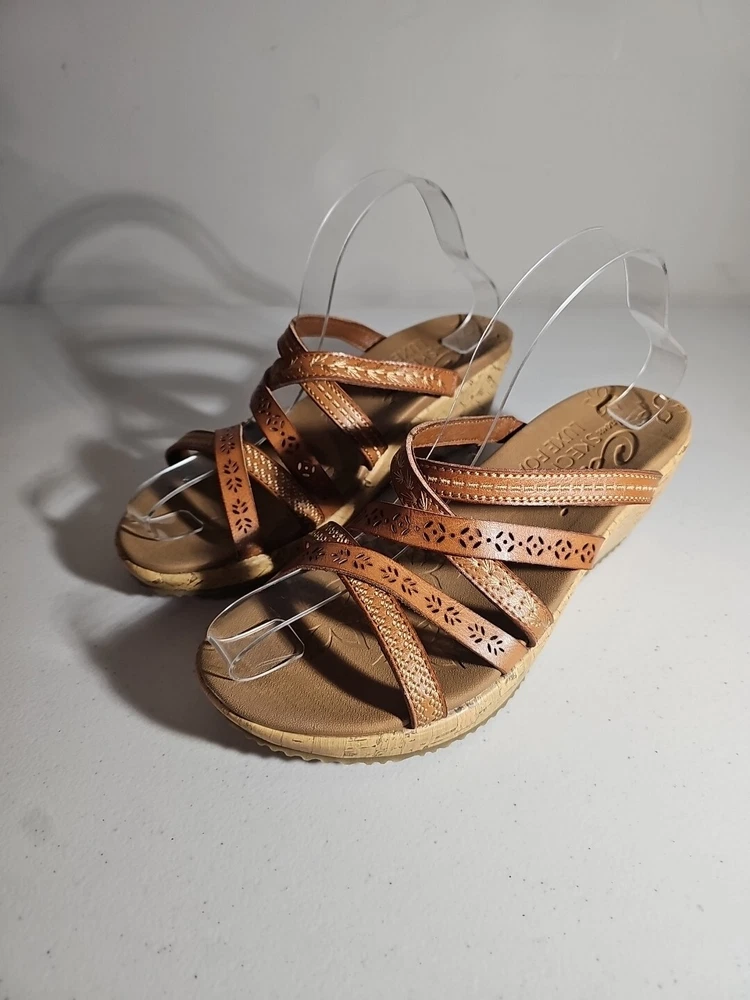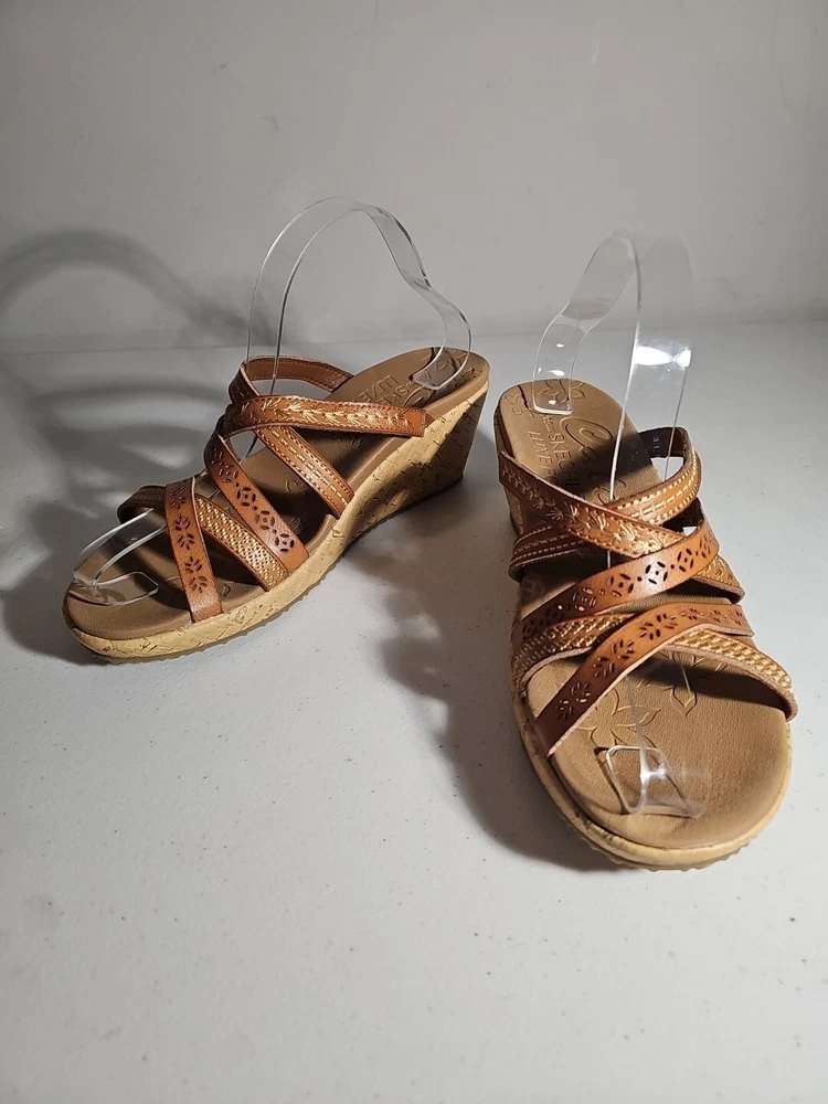 Elevate your casual comfort with these Skechers Beverlee Tiger Posse Wedge Slide Strappy Sandals in Women's Size 9. These sandals feature a slip-on closure and adjustable strap for a secure fit. The rubber outsole provides traction and durability, while the cushioned insole offers comfort and support. With a solid pattern and brown color, these sandals are perfect for summer, fall, and spring. The faux leather lining material and manmade upper material add to the durability and comfort. The Skechers Beverlee product line is known for its strappy design and casual comfort, making these sandals a great addition to any wardrobe. Super cute, worn once;)