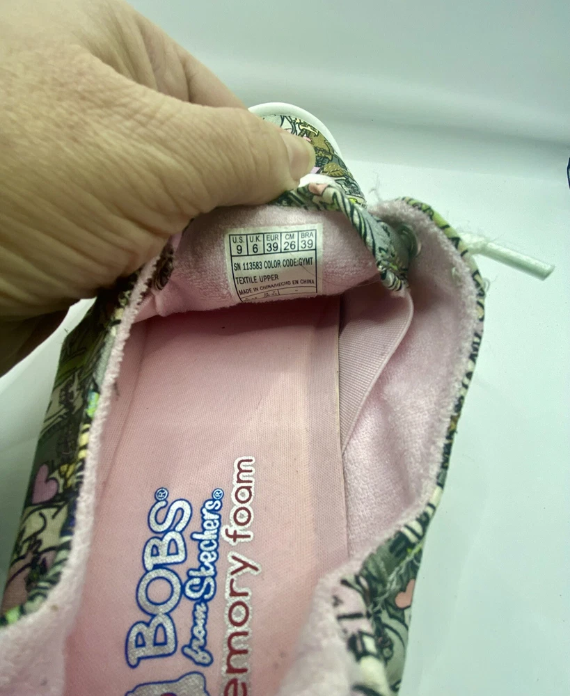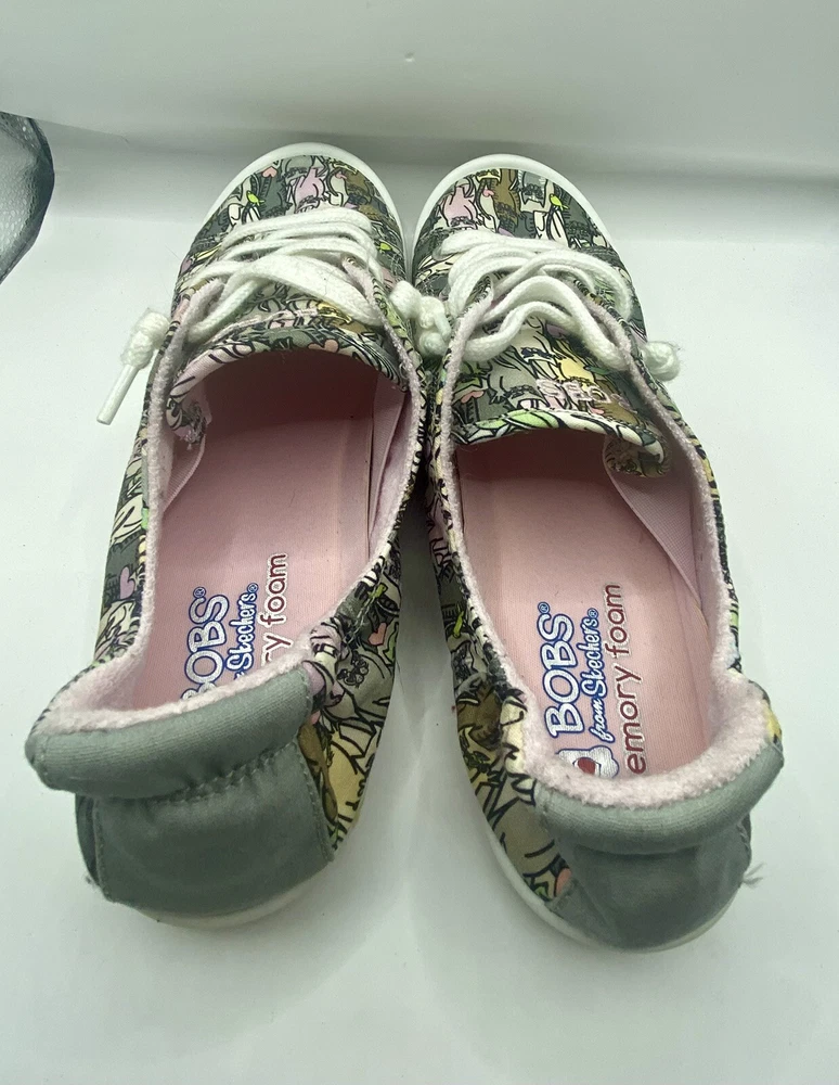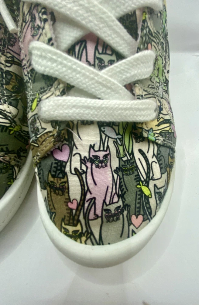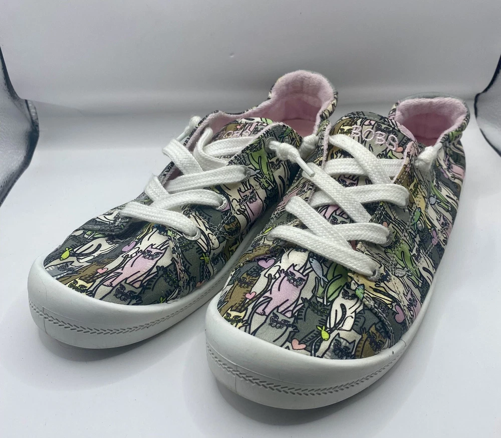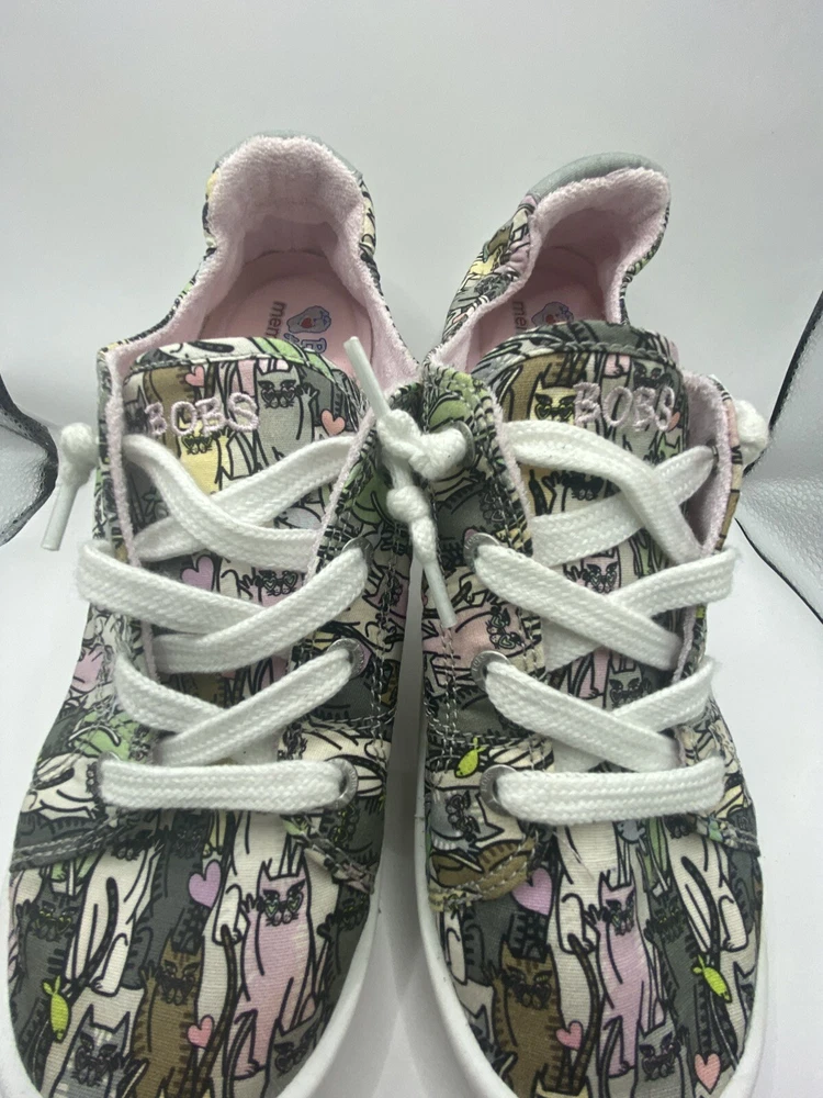 These Skechers Bobs Beach Bingo Kitten Bitten shoes are in good used condition. They are a very comfortable slip-on sneaker for women with a round toe shape and flat heel style. The shoe features a cute animal print pattern with cats and shoelaces accents. It is made with a fabric upper material, cushioned and breathable insole, and a rubber outsole for walking and school activities. The shoe is multicolored and available in US size 9, AU size 9, UK size 4, and EU size 37.