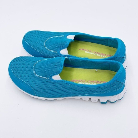 Skechers Memory Foam Go Walk Slip On Sneakers Bright blue and white with lime green insoles Slip on styling Comfort shoes Great for walking Size 9 Excellent pre-owned condition