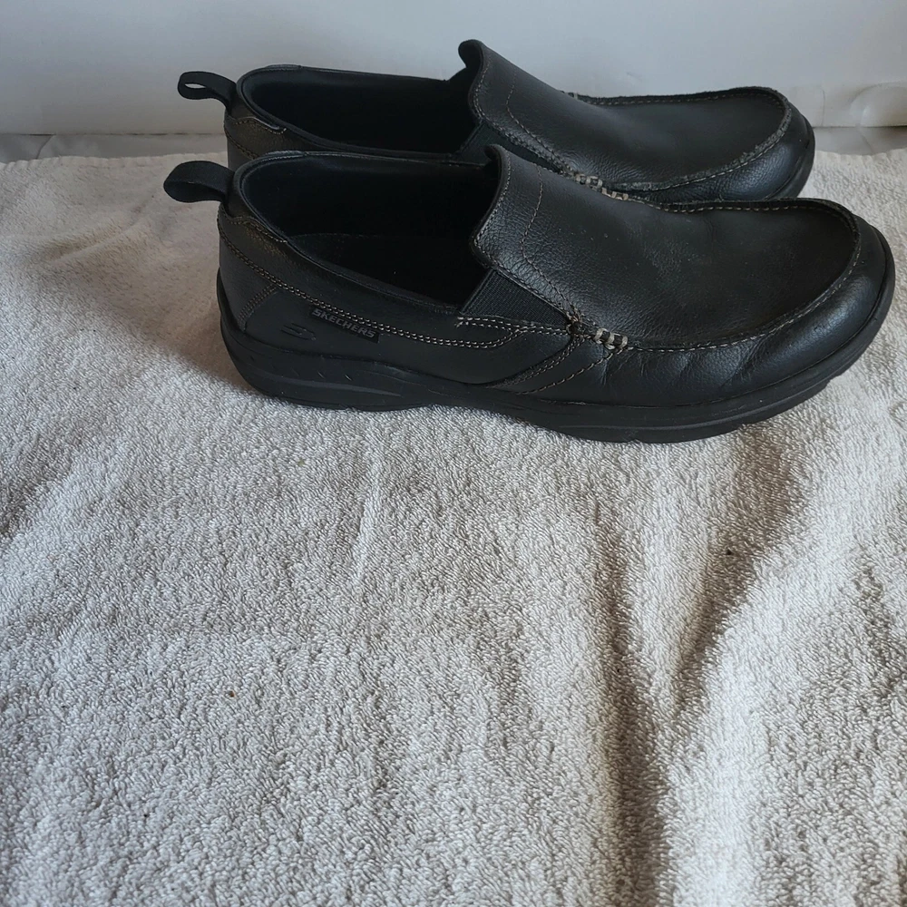 Step up your shoe game with these sleek Skechers Harper-Forde Slip-On Loafers. Made with high-quality leather, these black loafers are perfect for a casual look that doesn't sacrifice style. The slip-on design makes them easy to wear, while the sturdy sole provides comfort and support. These loafers are a must-have for any fashion-forward man's shoe collection.
