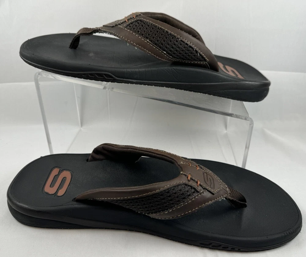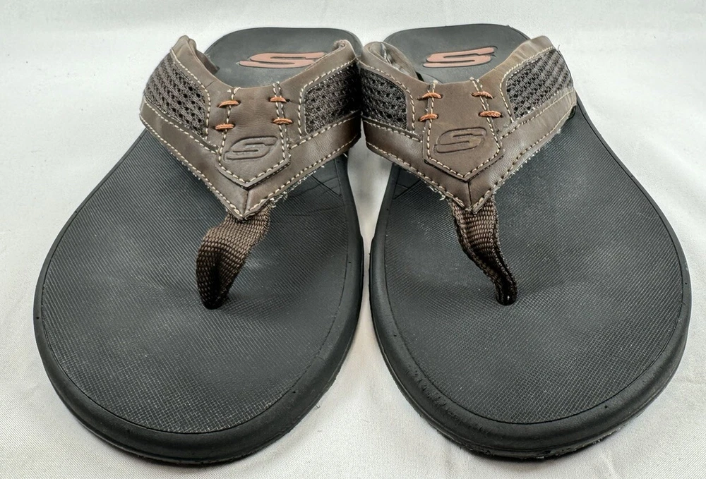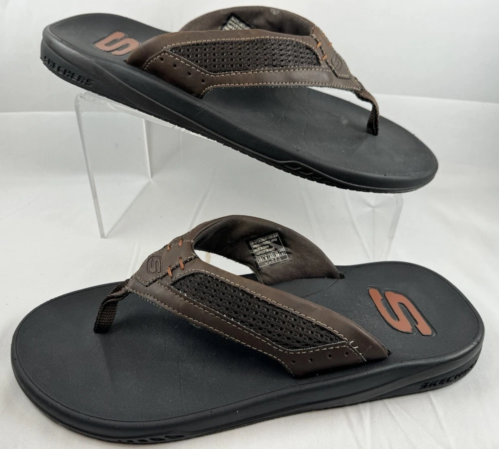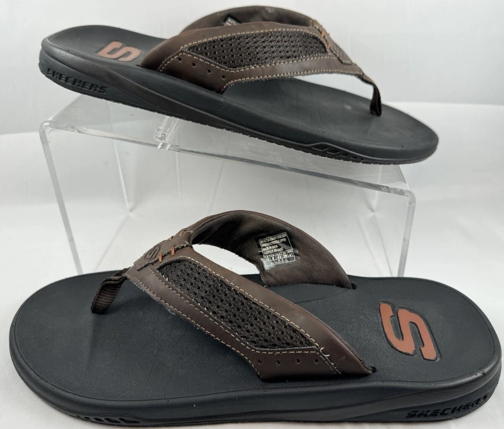 Product Line: Skechers Relaxed Fit Closure: Slip On Insole Material: Foam Model: Skechers Proven SD Upper Material: Synthetic UK Shoe Size: 9 EU Shoe Size: 43 Shoe Width: Standard Country/Region of Manufacture: China Outsole Material: Rubber Type: Sandal Seller Notes: “Please see pictures and description for any Imperfections / Sizing (Measurements)” Vintage: No Pattern: Solid Handmade: No Department: Men Features: Comfort Accents: Logo Season: Fall, Spring, Summer Style: Flip Flop Brand: Skechers US Shoe Size: 10 Occasion: Casual, Travel Color: Brown Customized: No Character: Flop
