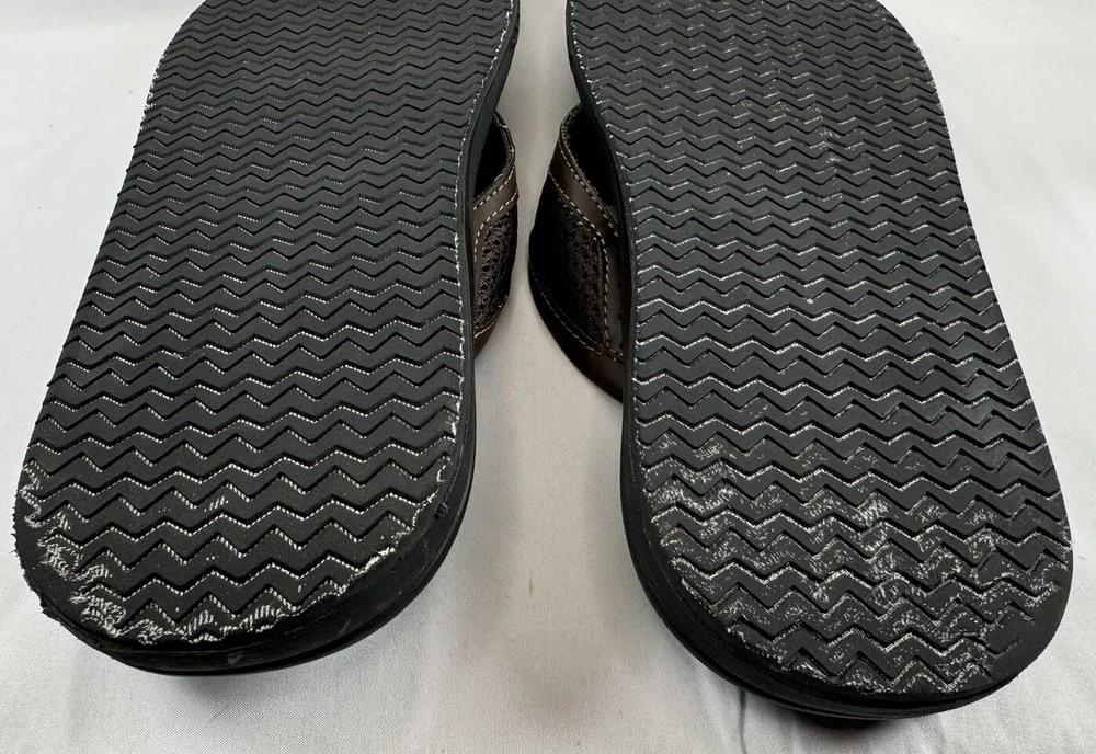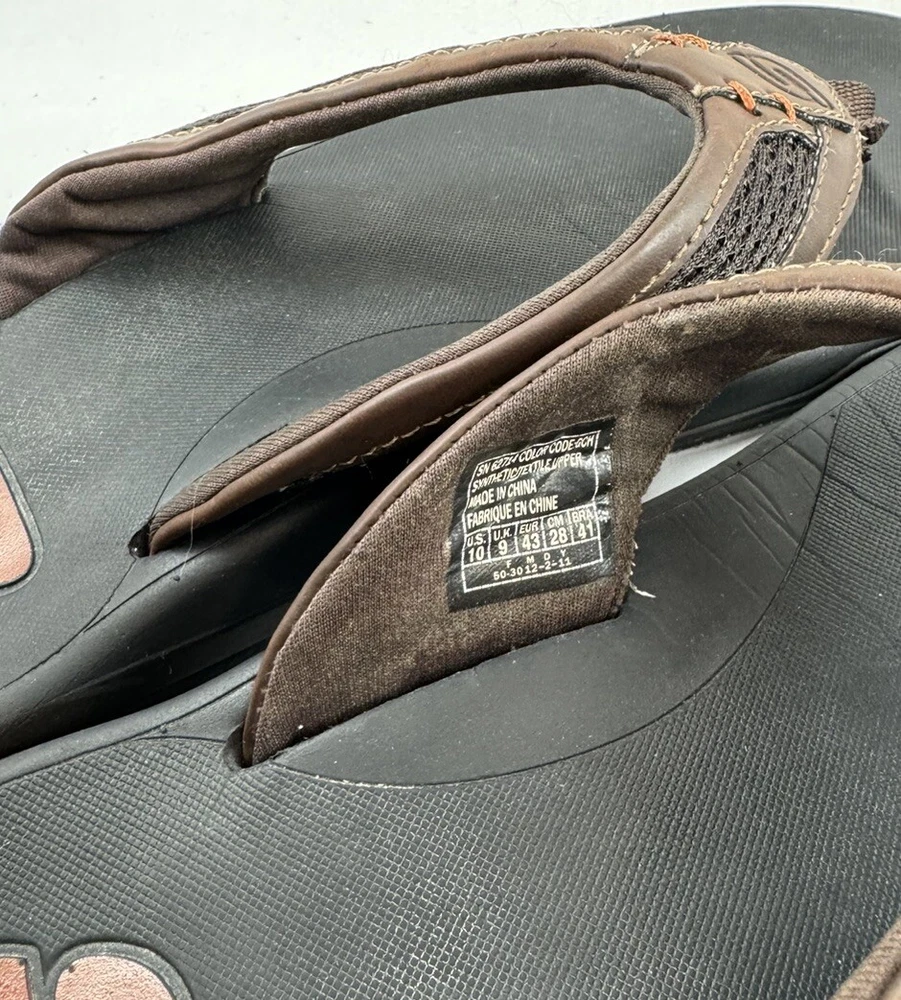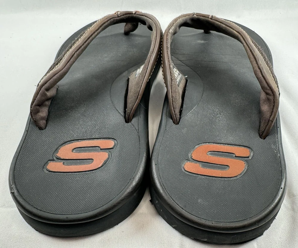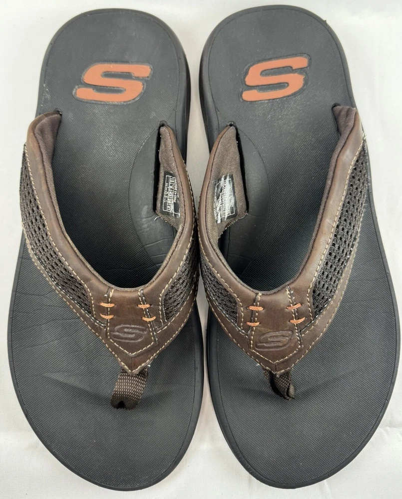 Product Line: Skechers Relaxed Fit Closure: Slip On Insole Material: Foam Model: Skechers Proven SD Upper Material: Synthetic UK Shoe Size: 9 EU Shoe Size: 43 Shoe Width: Standard Country/Region of Manufacture: China Outsole Material: Rubber Type: Sandal Seller Notes: “Please see pictures and description for any Imperfections / Sizing (Measurements)” Vintage: No Pattern: Solid Handmade: No Department: Men Features: Comfort Accents: Logo Season: Fall, Spring, Summer Style: Flip Flop Brand: Skechers US Shoe Size: 10 Occasion: Casual, Travel Color: Brown Customized: No Character: Flop