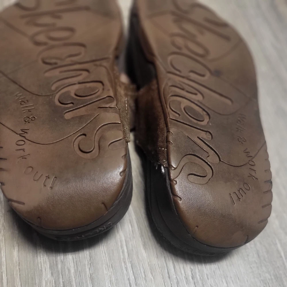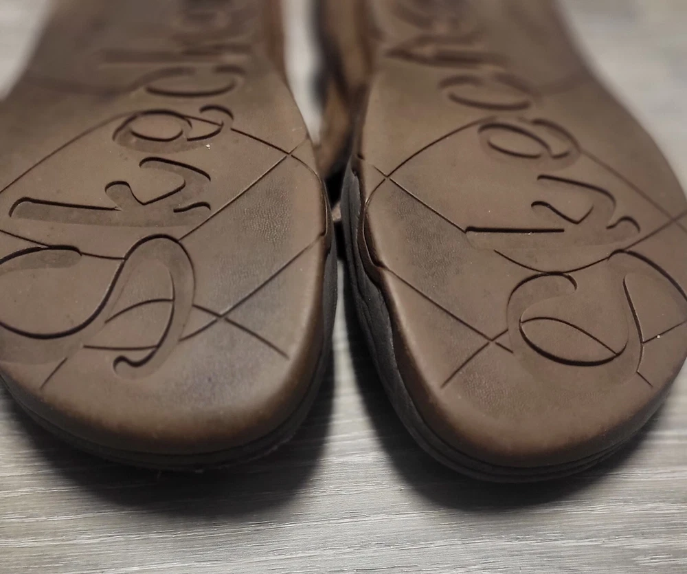 Step up your exercise game with these stylish Skechers Tone Ups Moonrock flip flops! These pre-owned sandals feature slip-on closure, low wedge heel, and synthetic outsole for comfort and durability. The brown suede leather upper with solid pattern adds a touch of elegance, while the synthetic insole provides toning benefits for your feet. The Skechers Tone Ups product line is known for its quality and reliability, making these flip flops a great addition to your shoe collection. Available in US shoe size 6 for women.