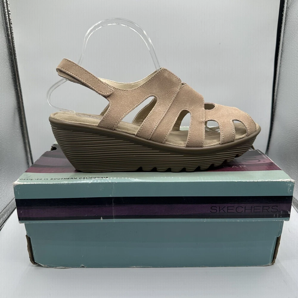 Skechers Women’s 10 Tan Memory Foam Parallel Stylin Wedge Heel Slingbacks Suede New with box, no flaws. Elevate your shoe game with these stunning Skechers Women's Memory Foam Parallel Stylin Wedge Heel Slingbacks. The tan-colored suede upper material and adjustable hook and loop strap make these sandals perfect for any occasion, whether it's a wedding, party, or a casual day out. The breathable features and wedge heel style ensure maximum comfort that lasts all day long. These sandals come in a UK shoe size 7, US shoe size 10, and EU shoe size 40. They have a solid pattern and a vintage-free design. The features of these sandals make them perfect for outdoor activities during spring and summer seasons. Add a touch of style to your wardrobe with these Skechers slingbacks.