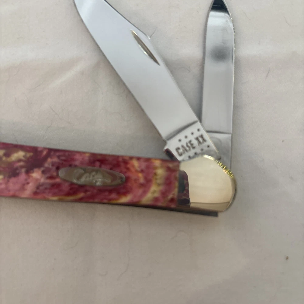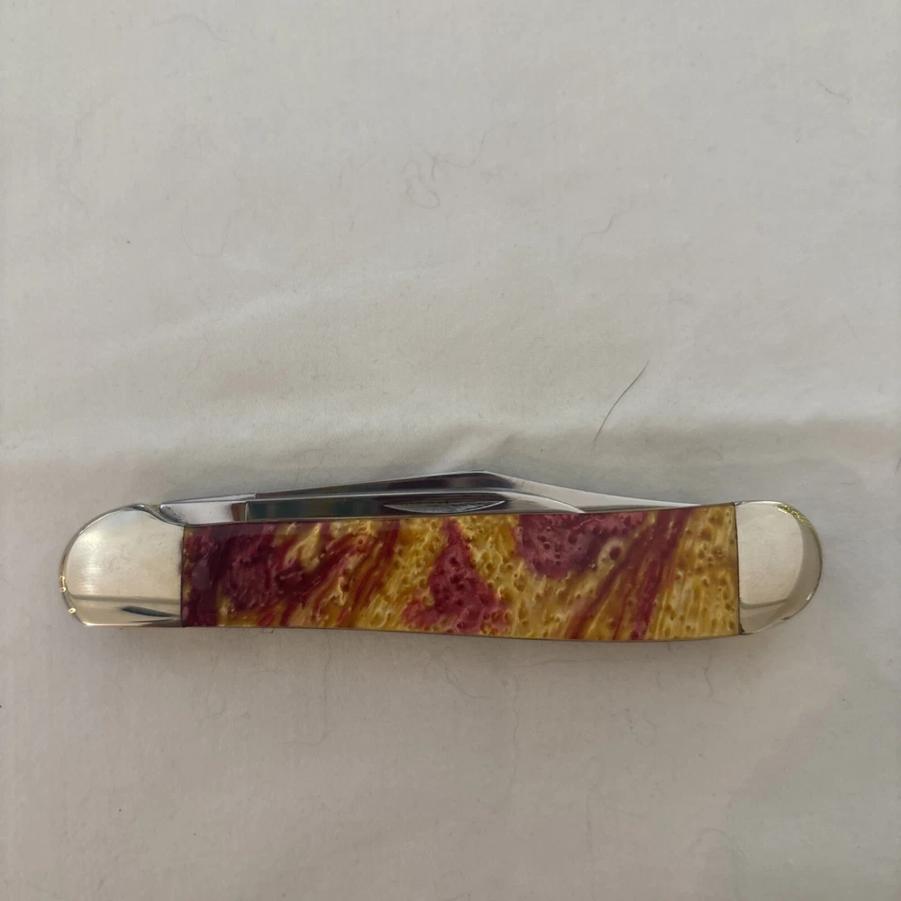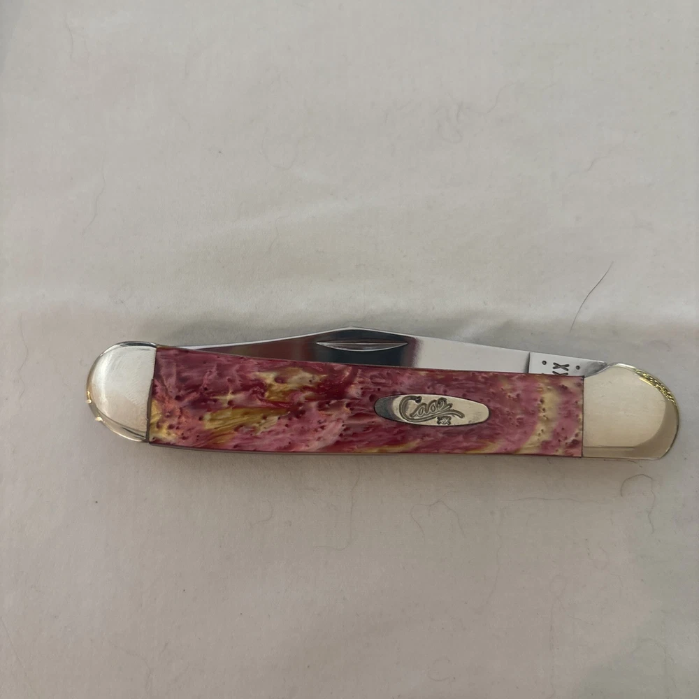 This unique skeleton pre-handed copperhead pocketknife is a must-have for any collector or outdoor enthusiast. The knife features a stunning yellow color with a bone handle and two stainless steel blades. The opening mechanism is manual, making it easy to use with both hands. This modern folding knife was manufactured in the United States in 2021 and is designed with ambidextrous dexterity. The knife's plain edge blade is perfect for everyday use, and the knife comes with a sheath for easy storage and transport. The Skeleton Pink pre-handed copperhead case knife is a great addition to any collection and is sure to impress.