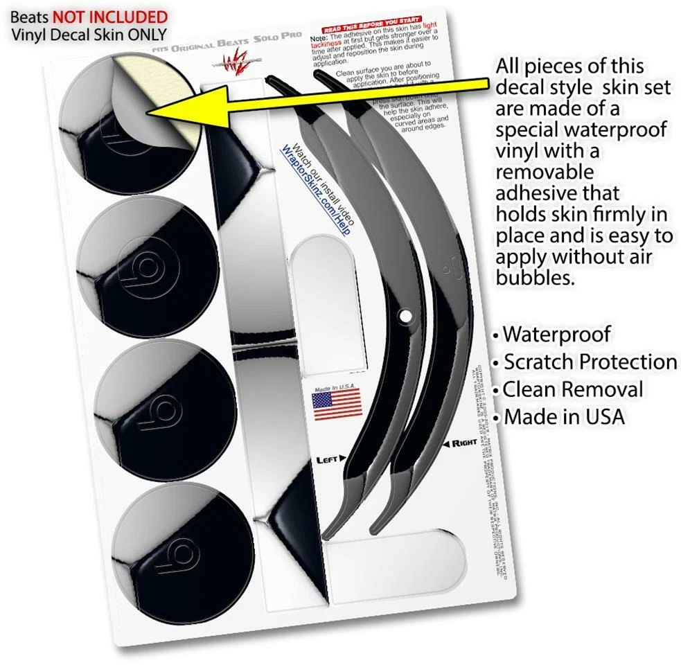 Notice: HEADPHONES NOT INCLUDED Fits: Beats Solo Pro v1 Original See more designs HERE . Features: Beats NOT INCLUDED - Only works with Beats Solo Pro v1 Original Headphones. Decal style skin wrap covers beats solo pro headphone band top surface and ear cups. Pro Grade Skin - Dual Layer tough vinyl material coated with a high gloss protective laminate. Easy to apply without air bubbles - Removal with no sticky residue. Ships From and Made In USA by WraptorSkinz ® This product is in no way affiliated with or endorsed by Apple or Beats brand products. WraptorSkinz ® skin wraps work with the Original Beats Solo Pro version 1 headphones. Printed using superb photo quality designs and vibrant colors printed with special fade resistant inks that last even in direct sun for years. WraptorSkinz are a composite of two layers of commercial grade materials. The bottom layer is a soft, flexible vinyl with a special removable adhesive that is easily positioned, applied without air bubbles. Next, we print the bottom layer with UV protected, fade resistant inks that deliver superb photo quality designs in vibrant colors. Finally, we bond a professional grade laminate over the entire skin adding a glossy protective finish.