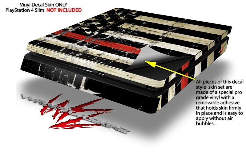 Notice: PS4 Slim Gaming Console NOT INCLUDED Fits: Sony PS4 Slim Console See more designs HERE . Features: Pro Grade Skin - Ships From and Made In USA by WraptorSkinz ® ONLY fits Sony Playstation 4 Slim Console. DOES NOT fit PS4 Original or Pro. PS4 Slim System NOT Included. Matching controller skins sold separately. Wrap covers top and sides, does not cover the bottom. Easy to apply without air bubbles. Dual Layer Tough professional grade vinyl material coated with a high gloss laminate. WraptorSkinz ® are self adhering vinyl skins that help prevent scratches and look great doing it. Unlike bulky silicon and plastic covers, WraptorSkinz ® are designed to be thin and very tough. WraptorSkinz ® are a composite of two layers of commercial grade materials. The bottom layer is a soft, flexible vinyl with a special removable adhesive that is easily positioned and applied without air bubbles. The bottom layer print with special UV protected, fade resistant inks that deliver superb photo quality designs in vibrant colors. Finally we bond a professional grade laminate over the entire skin adding a glossy protective finish.