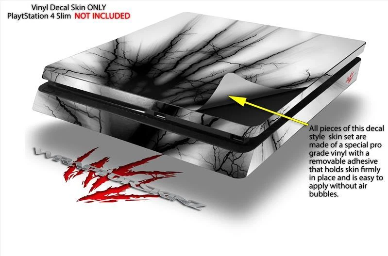 Notice: PS4 Slim Gaming Console NOT INCLUDED Fits: Sony PS4 Slim Console See more designs HERE . Features: Pro Grade Skin - Ships From and Made In USA by WraptorSkinz ® ONLY fits Sony Playstation 4 Slim Console. DOES NOT fit PS4 Original or Pro. PS4 Slim System NOT Included. Matching controller skins sold separately. Wrap covers top and sides, does not cover the bottom. Easy to apply without air bubbles. Dual Layer Tough professional grade vinyl material coated with a high gloss laminate. WraptorSkinz ® are self adhering vinyl skins that help prevent scratches and look great doing it. Unlike bulky silicon and plastic covers, WraptorSkinz ® are designed to be thin and very tough. WraptorSkinz ® are a composite of two layers of commercial grade materials. The bottom layer is a soft, flexible vinyl with a special removable adhesive that is easily positioned and applied without air bubbles. The bottom layer print with special UV protected, fade resistant inks that deliver superb photo quality designs in vibrant colors. Finally we bond a professional grade laminate over the entire skin adding a glossy protective finish.