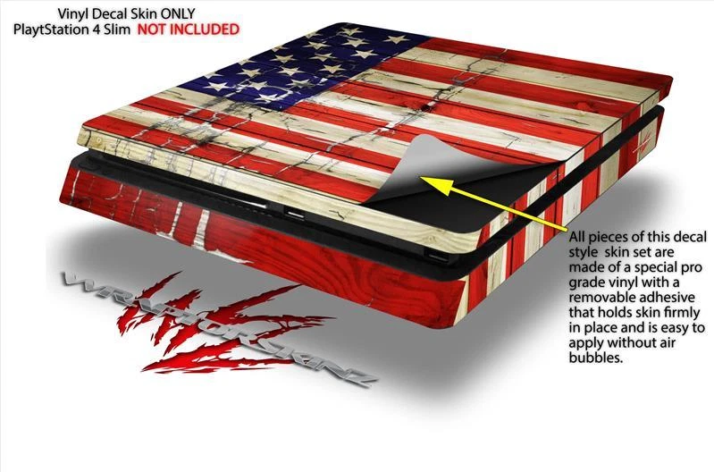 Notice: PS4 Slim Gaming Console NOT INCLUDED Fits: Sony PS4 Slim Console See more designs HERE . Features: Pro Grade Skin - Ships From and Made In USA by WraptorSkinz ® ONLY fits Sony Playstation 4 Slim Console. DOES NOT fit PS4 Original or Pro. PS4 Slim System NOT Included. Matching controller skins sold separately. Wrap covers top and sides, does not cover the bottom. Easy to apply without air bubbles. Dual Layer Tough professional grade vinyl material coated with a high gloss laminate. WraptorSkinz ® are self adhering vinyl skins that help prevent scratches and look great doing it. Unlike bulky silicon and plastic covers, WraptorSkinz ® are designed to be thin and very tough. WraptorSkinz ® are a composite of two layers of commercial grade materials. The bottom layer is a soft, flexible vinyl with a special removable adhesive that is easily positioned and applied without air bubbles. The bottom layer print with special UV protected, fade resistant inks that deliver superb photo quality designs in vibrant colors. Finally we bond a professional grade laminate over the entire skin adding a glossy protective finish.