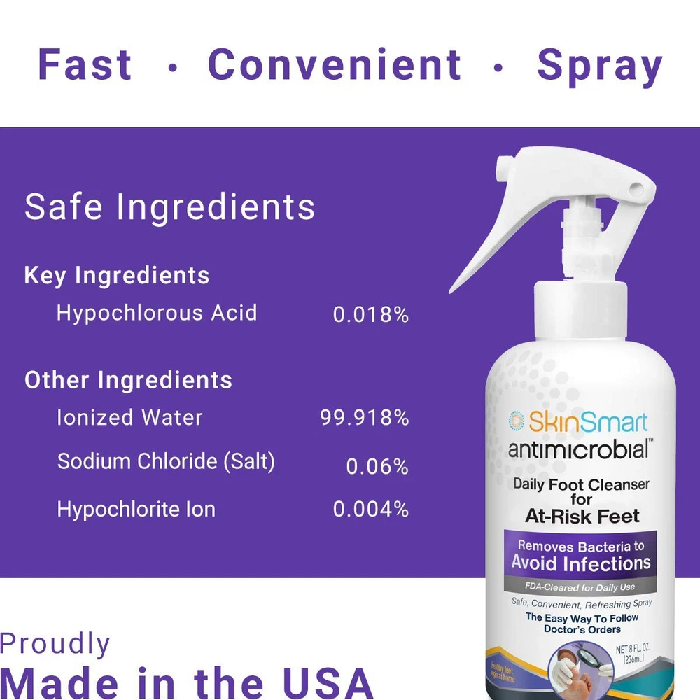 DOCTOR RECOMMENDED for Preventative Diabetic Foot Cleansing VERY SAFE for daily use, easy removal of bacteria from feet to avoid infections FAST & CONVENIENT SPRAY; Simply spray and let air dry, no scrubbing, no foot bath or rinsing needed SAFE FOR SENSITIVE SKIN, pH balanced, refreshing spray; leaves no irritating or harsh residue behind REMOVES BACTERIA as part of daily foot regimen; Quick solution that won’t dry out skin