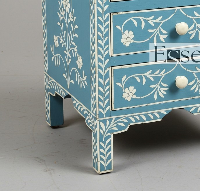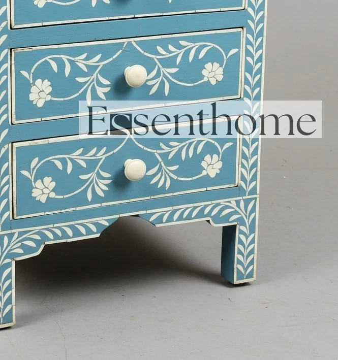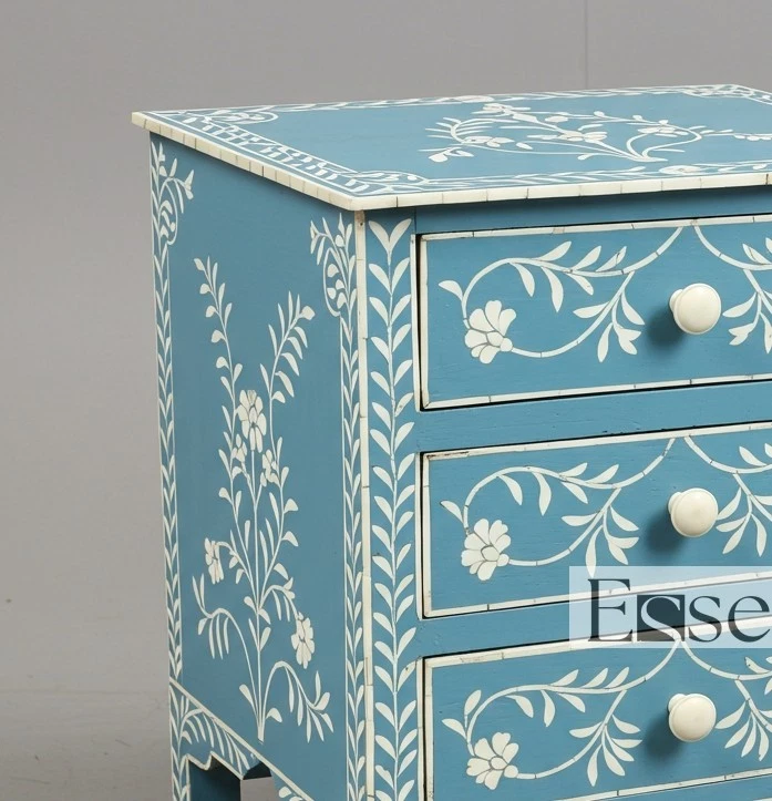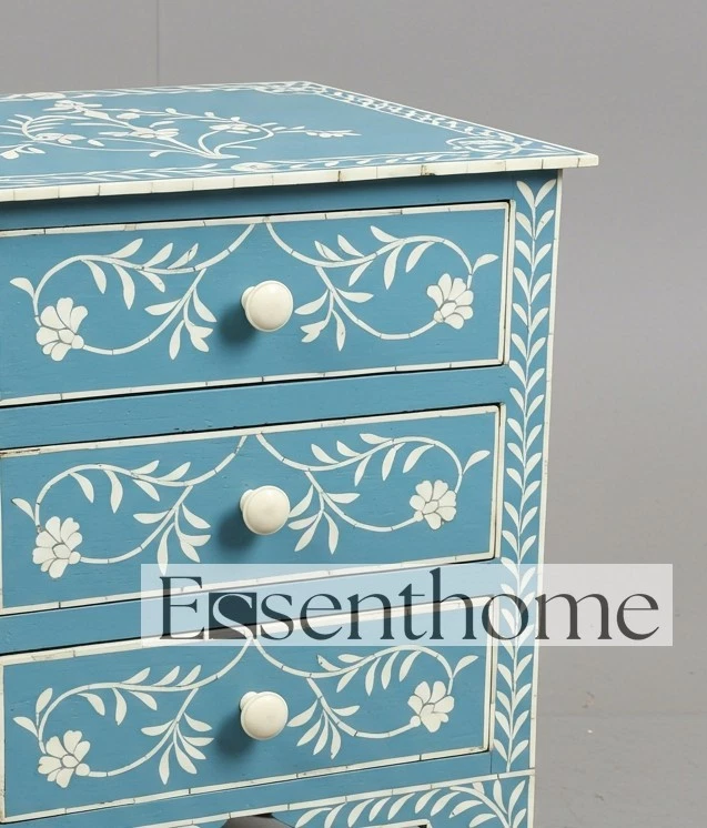Bring freshness and artisan charm to your space with this handcrafted Sky Blue Bone Inlay Bedside Table, featuring a delicate floral vine pattern and three functional drawers. Handmade by expert artisans in Rajasthan, India, this piece reflects generations of traditional craftsmanship, brought to life in a soft, refreshing sky blue palette. Each design element is hand-carved from ethically sourced camel bone and individually inlaid to form graceful flowers and trailing vines. The soothing sky blue resin creates a breezy, coastal-inspired backdrop for the inlay, while bone knobs on each drawer complete the look with a clean and harmonious touch. With three drawers offering practical storage, this piece works beautifully as a nightstand, side table, or decorative accent cabinet. Its cool tones and intricate design make it a perfect fit for light, airy interiors—whether coastal, bohemian, or feminine chic. Every piece is handmade, and minor variations in tone and inlay placement highlight the unique nature of your table, making it truly one of a kind. Product Specifications: Material: Bone Inlay, Solid Wood, Resin Pattern: Hand-Inlaid Floral Vine Motif Color: Sky Blue Base with White Bone Inlay Drawers: 3 Drawers with Coordinated Bone Knobs Finish: Matte Smooth Finish Style: Coastal Bohemian, Ethnic Luxe, Soft Artisan Origin: Handmade in Rajasthan, India Care Instructions: Wipe clean with soft cloth; avoid abrasive materials Assembly: No assembly required