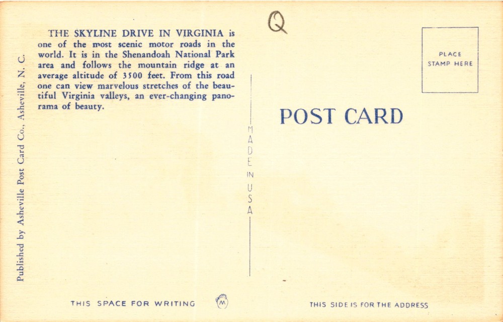 The postcard depicts an image of the Skyline Drive in Virginia, located about 3 miles north of Swift Run Gap. The Skyline Drive is renowned as one of the most scenic motor roads globally, situated within the Shenandoah National Park.