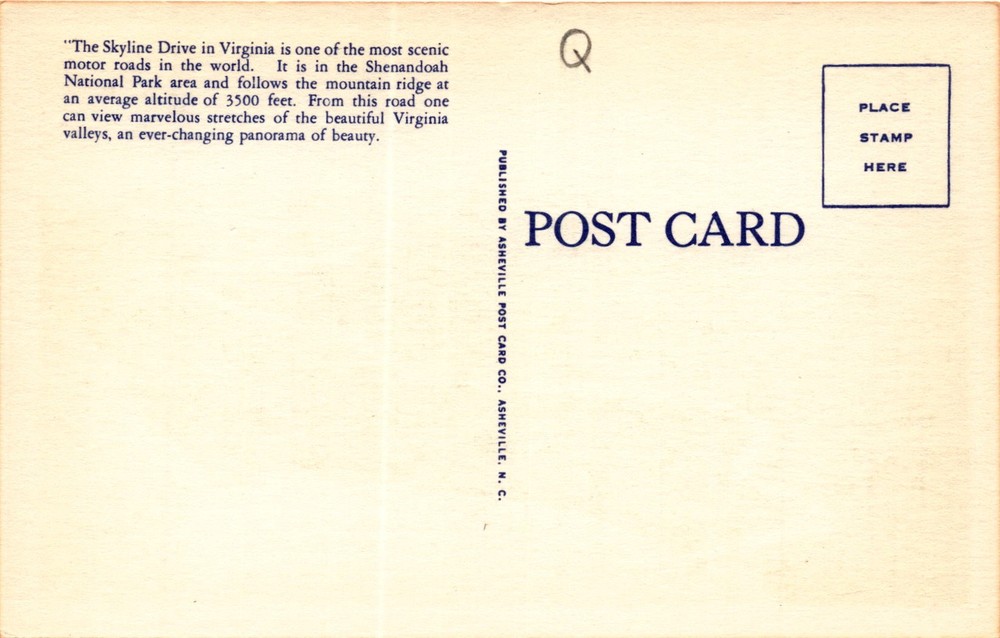 The postcard features a close-up and distant view of the Skyline Drive in Virginia, a scenic motor road in the Shenandoah National Park area. The road follows the mountain ridge at an average altitude of 3500 feet, offering breathtaking views of the beautiful Virginia valleys.