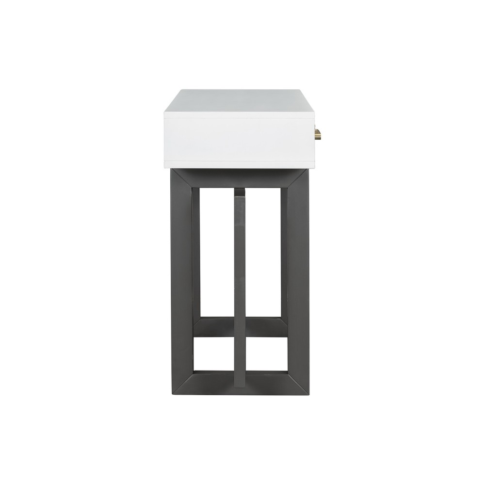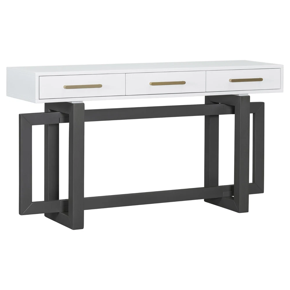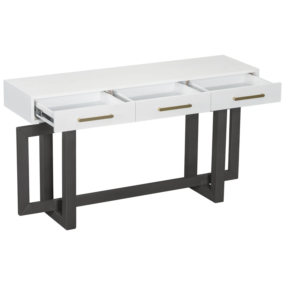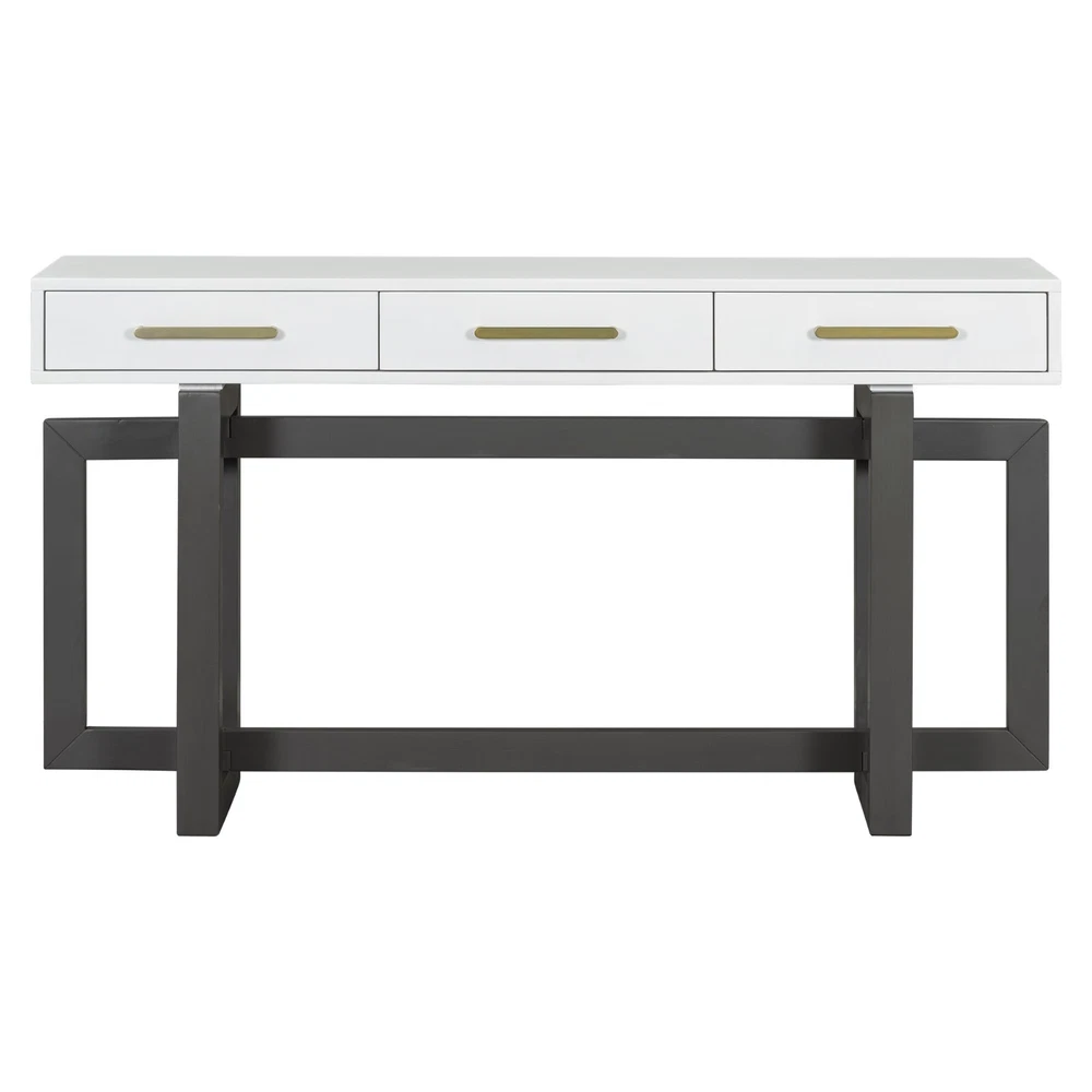 Specification Product Information Item Code: N711P175776M Product Type: General Item Product Name: U_STYLE Elegant Console Table with Three Drawers, Extra Long Entryway Table for Entryway, Hallway, Living Room, Foyer, Corridor Main Color: Grey+White Main Material: MDF Product Style: Artsy Use Case: Primary Living Space Storage Type: Drawers Product Dimensions Assembled Length (in.): 57.00 Assembled Width (in.): 15.70 Assembled Height (in.): 30.60 Weight (lbs.): 90.11 Package Size Length (in.): 61.02 Width (in.): 18.70 Height (in.): 13.39 Weight (lbs.): 98.11 Product Features [Modern Simplicity]The table features a modern minimalist design with smooth lines and a simple shape, making it easy to blend into various environments. Its sleek and understated aesthetic complements both contemporary and traditional spaces, providing a versatile and stylish addition to any room. [Higher Stability]The support structures under the table are located on the left and right sides. They are not only sturdy and durable but also effectively distribute the weight of the tabletop, ensuring the table's stability and safety during use. [Functional and Versatile]The table is equipped with three drawers, each with a handle on top for easy opening and closing. These drawers are designed with storage needs in mind, allowing you to organize office supplies, documents, or other personal items, keeping the tabletop neat and tidy. [Convenience]The drawers are equipped with high-quality iron slides, ensuring smooth operation even after long-term use. These durable slides provide reliable performance, allowing you to open and close the drawers effortlessly and maintaining their functionality over time. [Easy Assembly]With straightforward instructions and provided hardware, this set can be quickly and effortlessly assembled. Description Product Information Table Top Material MDF Leg Material MDF Handle Material Iron Top Weight Capacity 220 lbs Drawer Weight Capacity 50 lbs Number of Drawers 3 Supplier Intended and Approved Use Residential Use Country of Origin Vietnam Installation Precautions Tips 1 It is best to lay cardboard on the ground before installation to avoid staining or scratching the product. Tips 2 Try to avoid friction between product partes during installation, otherwise it may cause scratches that are difficult to remove. Tips 3 Do not tighten the screws 100% too early. Notice About Color Due to screen display or light problems, the color of the products received may be slightly different from the pictures, Please refer to the actual product for the actual color. About Size Sizes are measured manually, there will be some slight differences.