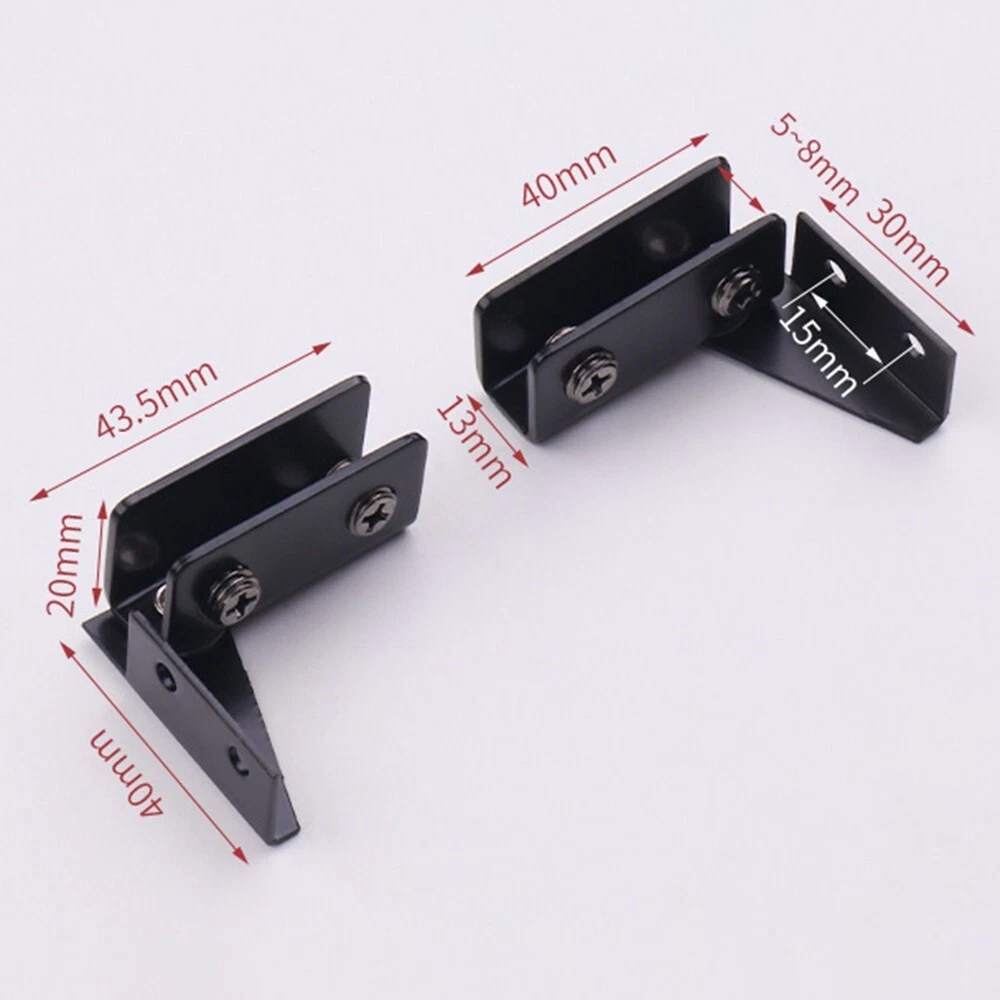 Sleek NonPorous Stainless Steel Hinges Two Pack Great for Various Applications DESCRIPTION Features: *Non-porous glass hinges: Made of high-quality stainless steel, these hinges are and reliable. *Smooth opening and closing: These hinges for ensure a seamless without any holes required in the glass. *Versatile application: Suitable for reinforcing and assembling glass in showcases, containers, fish tanks, etc. Can be used with glass glue. Adjustable screws make them suitable for most glass, ranging from 5-8mm thickness. *Secure installation: Install these hinges in your bathroom or kitchen to secure glass panels, glass shelves, and more. * construction: These hinges are made to last, providing a reliable solution for your glass door or cabinet needs. Specifications: *Product Name:Glass hinges *Material:Stainless steel *Size:43.5*40mm *Color:black,silver *Suitable glass thickn: about 5-8 mm Package Content: 2 x glass clips Note: . The real color of the item may be slightly different from the pictures shown on website caused by many factors such as brightness of your monitor and light brightness. 2. Please allow slight manual measurement deviation for the data. POLICES Shipping Payment WARRANTY We only ship to confirmed ebay Order addresses. Please comfirm that your Order address is in line with your shipping address. Please kindly note that the c ombined shipping is not provided because the shipping fee is calculated by weight. Also, the each additional item means exactly the the same color and size. It takes about 7 -15 working days to US; about 10-30 working days to other countries. Transit time may be a little delayed because of the bad weather and customs inspection . If you do not receive your item within 30 working days since payment finished, please contact us immediately for further assistance. Payment must be completed within 5 days. If you have any problems about payment, please contact us via ebay message. We strive for 100% customer satisfaction! Positive Feedback is very important to us. If you have any questions, p lease feel free to contact us via "Ask seller a question" . We will reply your email within 24 working hours.