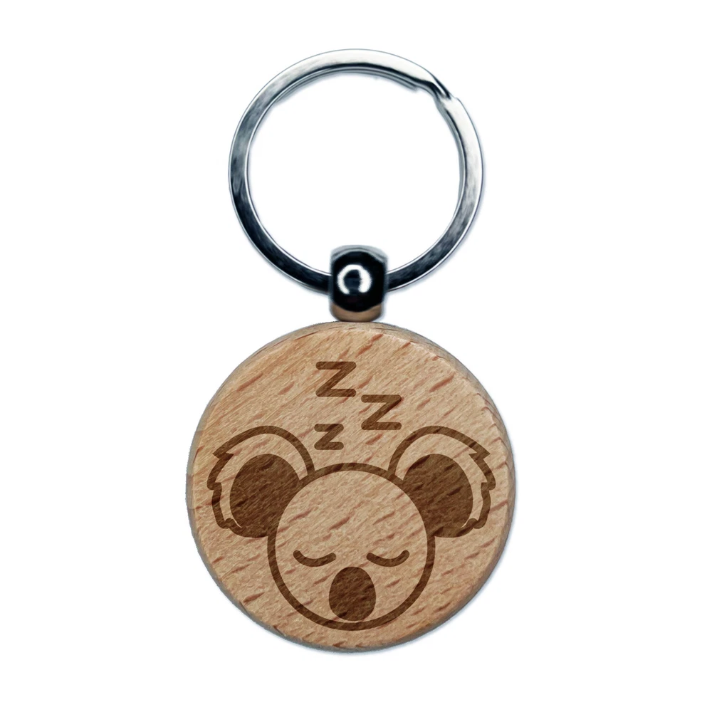 Sleepy Koala Head Engraved Wood Round Keychain Tag Charm