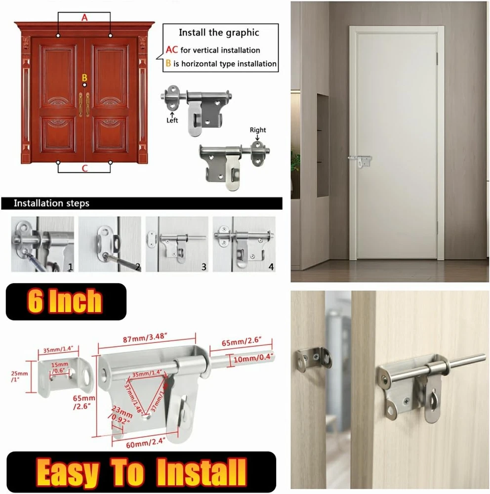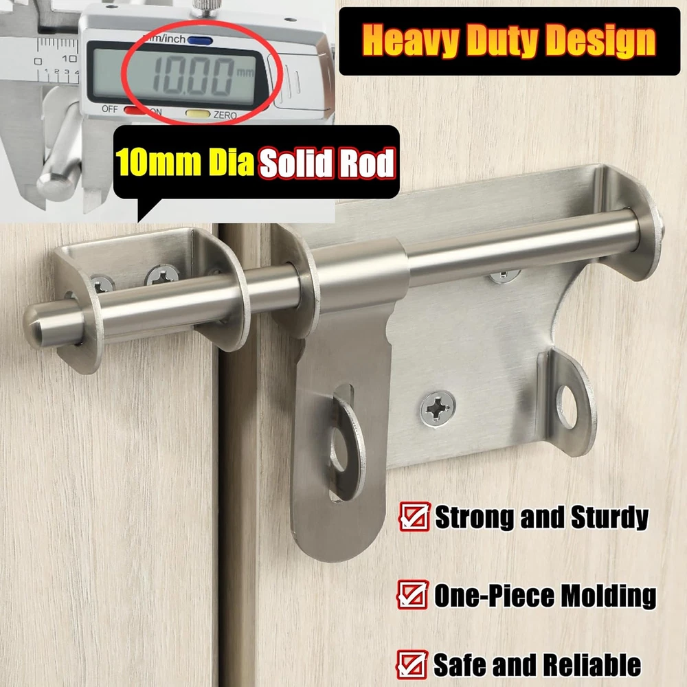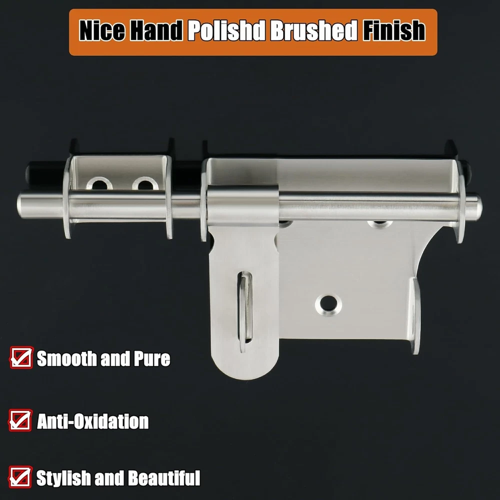 【Premium Quality Material】The bolt latches constructed from hi-q solid stainless steel, ensuring quality and longevity, strong and durable, not easy to rust and oxidation 【Hand Brushed Finished】The padlock latch is finished by hand fine polishing brushed, with smooth and pure surface, retaining the most original beautiful stainless steel color, which can resist daily scratches and corrosion 【Safe and Practical Design】Padlock can be installed with it, very practical and safe design, great security features to Offers Reliable Protection Against Intruders. 【Heavy Duty Design】10mm solid stainless steel latch rod, thickened metal latch body, one-piece molding without welding, heavy duty and strong design, greatly increased safety 【Come With Padlock】Includes padlock set, install with a padlock, add an extra layer of reliable protection; Applicable to all kind of bathroom doors,Fence Gate, French door, toilet, windows, barns, garage doors, pet doors, inside the door etc Product Description WIDELY USED Applicable To All Kinds of Doors 1 Interior Door 2 Barn 3 Pet Room 4 Fence 5 Front Door More Details About The Bolt Latch 1 2 3 4 5 6 Large Sise/6 Inch Two Sizes Are Available Heavy Duty With A Padlock Safe and Reliable Heavy Duty With A Padlock Safe and Reliable Small Size/4 Inch SET(With A Padlock)