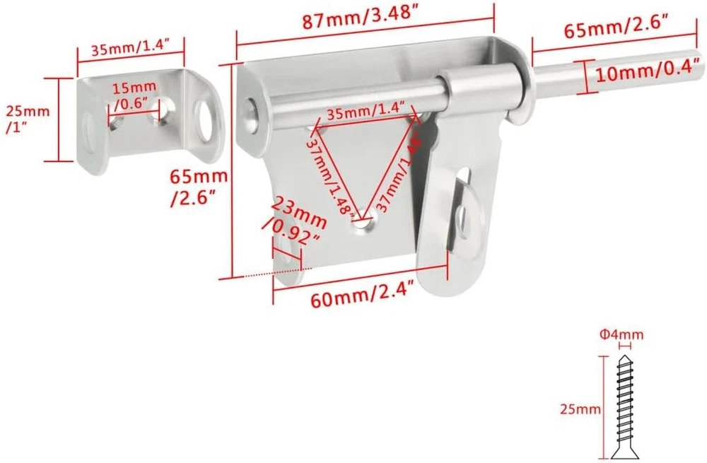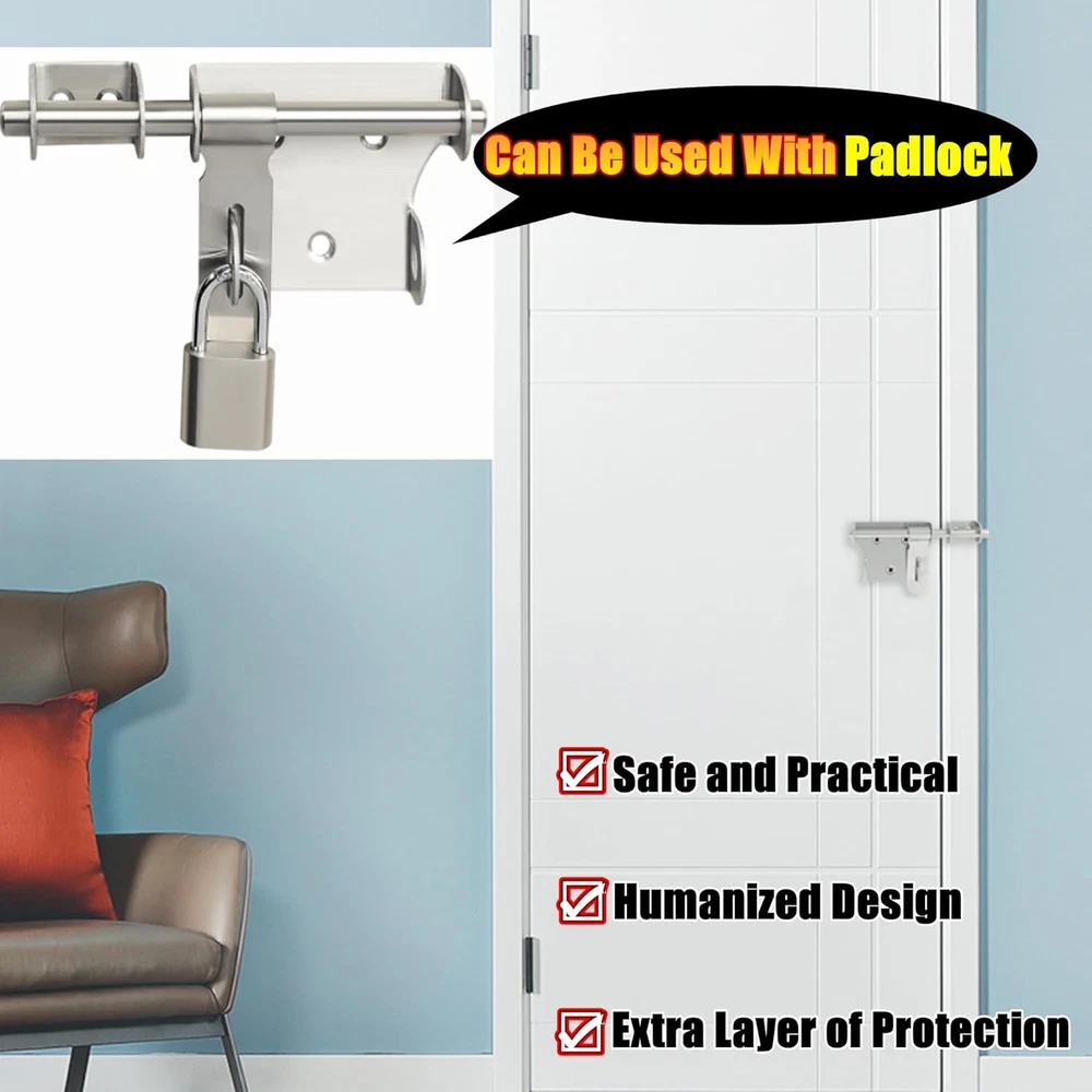 【Premium Quality Material】The bolt latches constructed from hi-q solid stainless steel, ensuring quality and longevity, strong and durable, not easy to rust and oxidation 【Hand Brushed Finished】The padlock latch is finished by hand fine polishing brushed, with smooth and pure surface, retaining the most original beautiful stainless steel color, which can resist daily scratches and corrosion 【Safe and Practical Design】Padlock can be installed with it, very practical and safe design, great security features to Offers Reliable Protection Against Intruders. 【Heavy Duty Design】10mm solid stainless steel latch rod, thickened metal latch body, one-piece molding without welding, heavy duty and strong design, greatly increased safety 【Easy To Install】Installation hardware includes, It just only takes a few minutes to install the gate latches; Applicable to all kind of bathroom doors,Fence Gate, French door, toilet, windows, barns, garage doors, pet doors, inside the door etc Product Description WIDELY USED Applicable To All Kinds of Doors 1 Interior Door 2 Barn 3 Pet Room 4 Fence 5 Front Door More Details About The Bolt Latch 1 2 3 4 5 6 Large Sise/6 Inch Two Sizes Are Available Heavy Duty With A Padlock Safe and Reliable Heavy Duty With A Padlock Safe and Reliable Small Size/4 Inch SET(With A Padlock)
