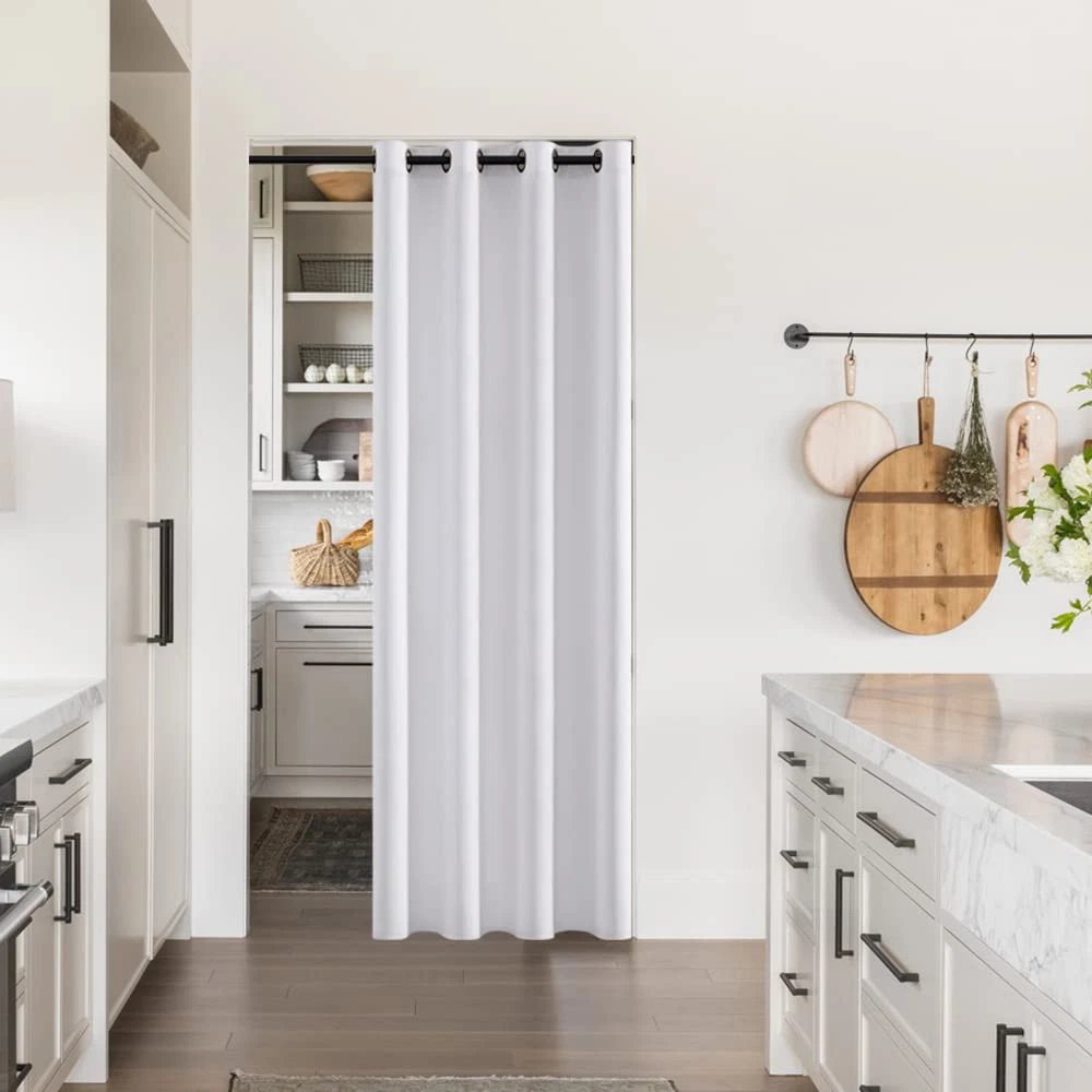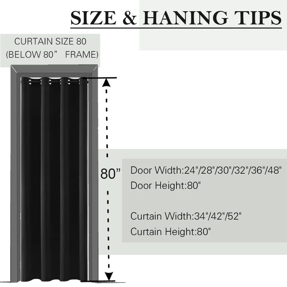Alternative Door Ideas:Tired of not economical wood/vinyl doors?Broken tracks?Small areas not enough room such as RV?Need more conveniently pass through?This easy install soft fabric drapery is perfect for you instead of doors now. Performance:Keep full privacy against the other side.90-100% blackout. Pls understand dark colors work better.Thermal insulated like a thin blanket to keep warm in winter and block cold to save energy and ac budget.Also help on sound proof and noise cancelling. Unique Size:Custom made at 52 inch wide by 80 in drop covering basic door openings at 24x80,28x80,30x80,32x80,36x80.Pls note as the vintage antique bronze grommets sliding takes some width,you should choose a door curtain wider than the opening.If you also like accordion door and keeping the elegant ruffle effect when folded,wider size is also smart choice. Multi Functions:Simple but versatile at closet door,bathroom door,kitchen door,bedroom door,front door,sliding glass door and any openings. Product Info:Beautiful rings at top for silky sliding and folding.cloth TIEBACK included for temporary open needs.NO CURTAIN ROD INCLUDED.NO BEADS.