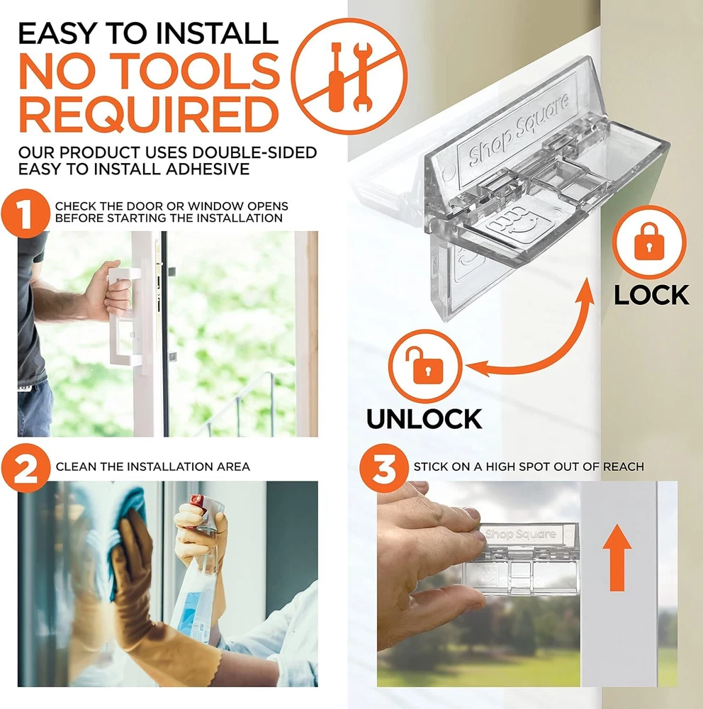 Sliding Door Lock for Home Safety - 2 Pack Sliding Window Locks, Sliding Glass Safety First: Our sliding glass door lock, which is also used as a window lock, provides you and your family additional security; Great for keeping wandering loved ones inside and unwanted guests out with child safety locks for doors and windows designed for home protection. Ease of use: Install our patio door lock quickly and easily without any tools necessary using double-sided, easy install/removal adhesive. Just peel and press for a strong, lasting hold for your window stopper. Easy for adults but impossible for children and pets, the sliding door lock is easily lifted with a finger to lock and simply pressed down to unlock. Out of sight: The crystal-clear design of the locks blend to match any glass door or window making them virtually invisible when installed high and out of reach from your little adventurers. Durable quality: Made with strong plastic and double sided adhesive, the lock for sliding door blocks the door or window from moving when attempting to be opened without losing effectiveness, even when routinely opened and shut, and will not cause damage to the frame. Shipping We offer FREE shipping on all orders! We ship within Three business days of payment, usually sooner. We use a selection of shipping services such as UPS, FedEx, USPS etc. We only ship to the lower 48 states, no APO/FPO addresses or PO Boxes allowed. Local pickups and combined shipping options are not provided at this time. Return You can return a product for up to 30 days from the date you purchased it. Any product you return must be in the same condition you received it and in the original packaging. Please keep the receipt. Payment We accept payment by any of the following methods: PayPal Please pay as soon as possible after winning an auction, as that will allow us to post your item to you sooner! Feedback Customer satisfaction is very important to us. If you have any problem with your order, please contact us and we will do our best to make you satisfied. Contact Us If you have any queries, please contact us via ebay. We usually respond within 24 hours on weekdays. Please visit our eBay store to check out other items for sale! Thank you for shopping at our store.