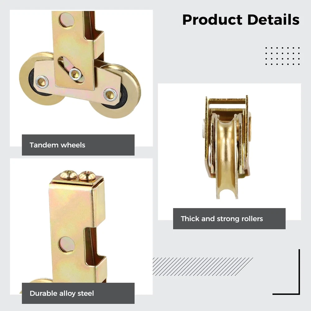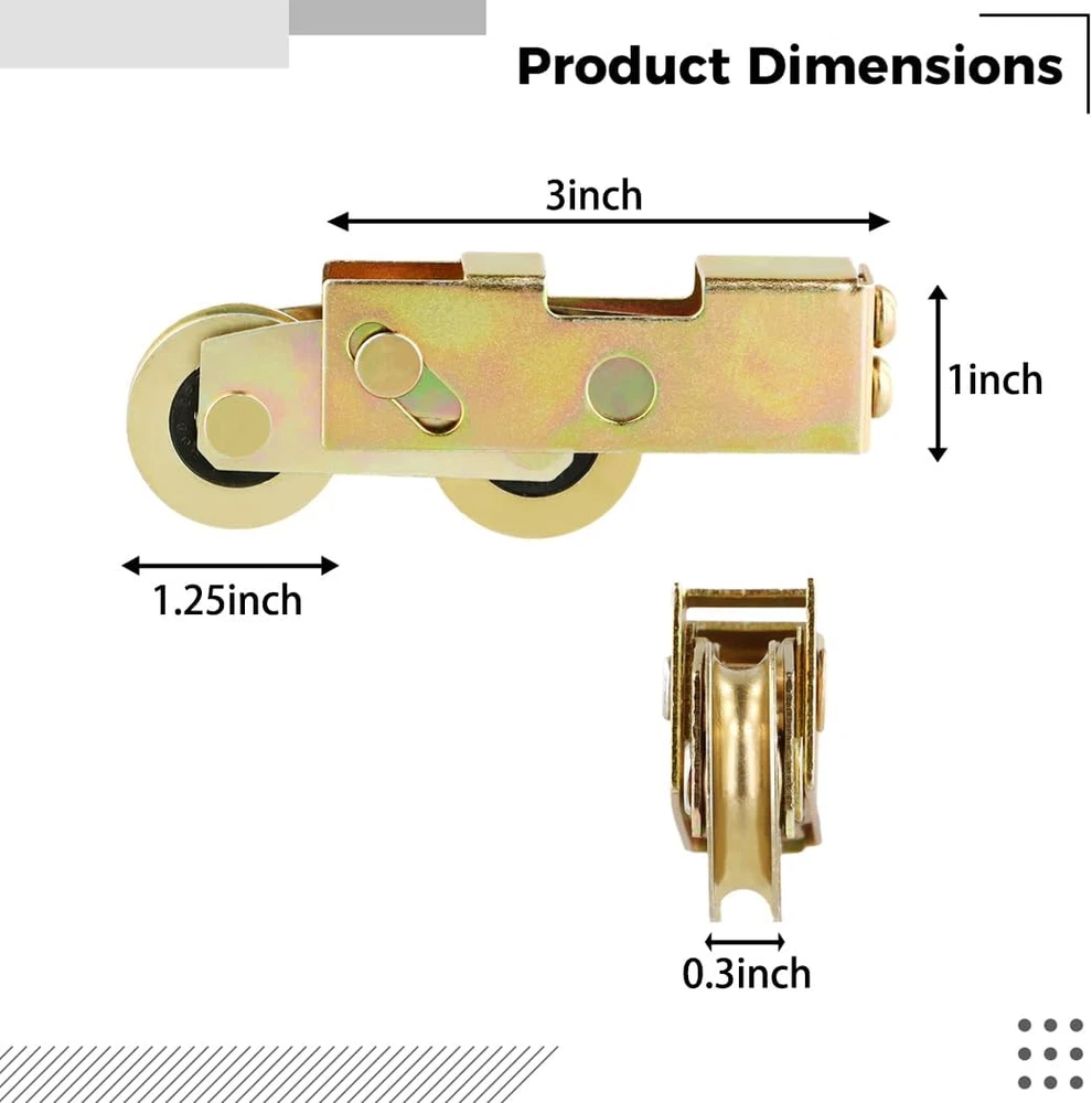 【Solid Construction】 Made of premium alloy steel with exquisite workmanship, the sliding door tandem roller is strong, heavy-duty, anti-rust, and corrosion-resistant, which can withstand loads up to 120kg/265lbs and is uneasy to rust or break even used in a humid environment. 【Standard Size】 The sliding door roller measures 1-1/4 inches in wheel diameter and 5/16 inches in wheel thickness(width), a suitable size to fit most sliding doors and widows. The roller will be a good choice for replacing a damaged roller to restore your sliding door to normal use. 【Easy to Install】 Quick and simple installation without extra tools. Just remove the damaged or missing tandem roller assemblies from your sliding door and install the new sliding wheels. Your sliding door will function again after the installation! 【Set of 2pcs Siding Door Rollers】 You will receive 2pcs sliding door tandem roller assemblies. They are of high quality with super smoothness on the bearing, and easy to slide without causing harsh noise. With the rollers, opening a sliding door will not be an effortful thing anymore! 【Widely Used】 Our sliding patio door wheels work well for sliding glass doors, screen doors, sliding gates, wood/extruded aluminum/vinyl patio doors, sliding windows, closets, wardrobes, and more. Reach out to us if you have any questions. We’re always there for you. Product Description