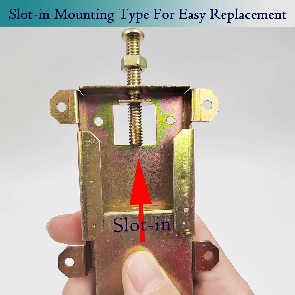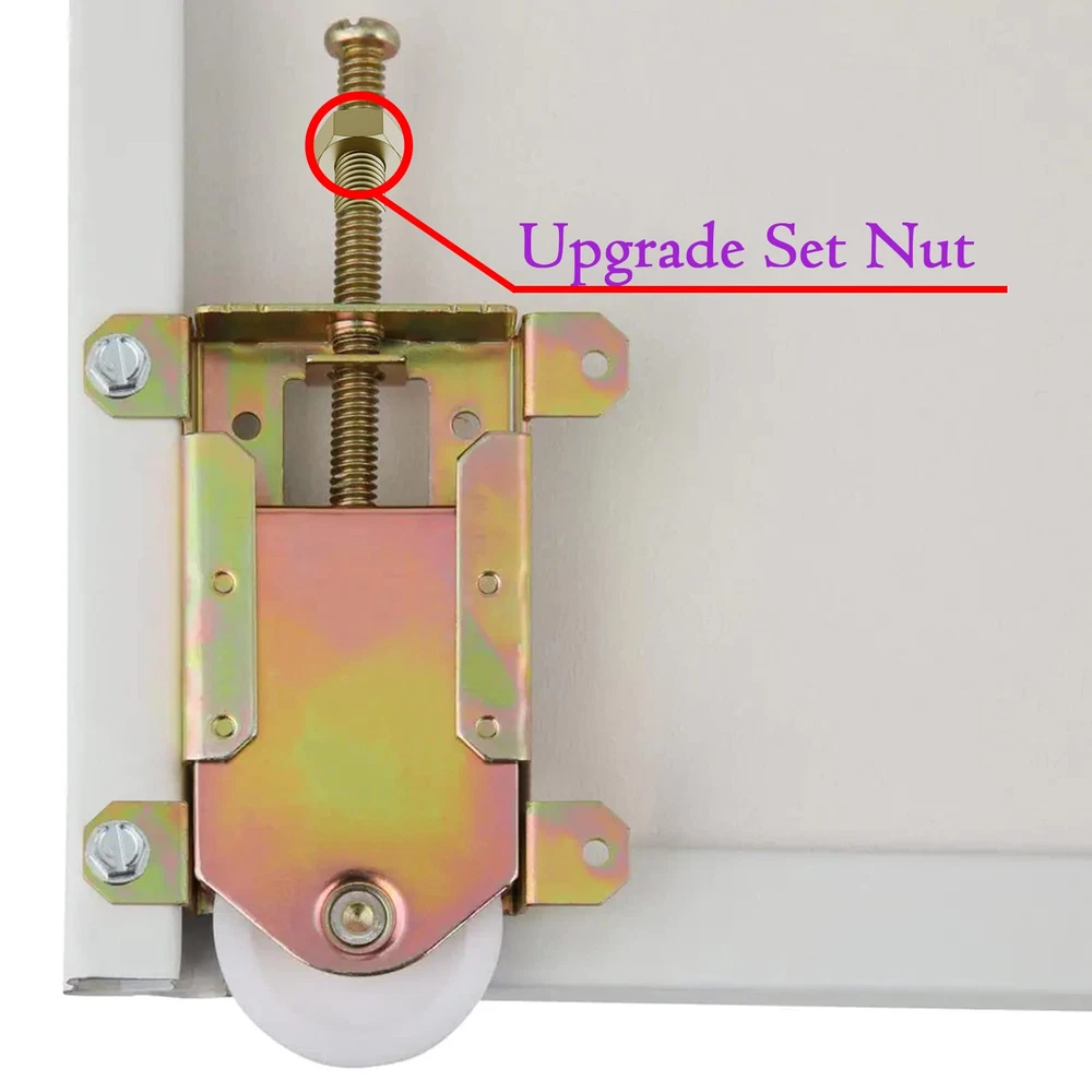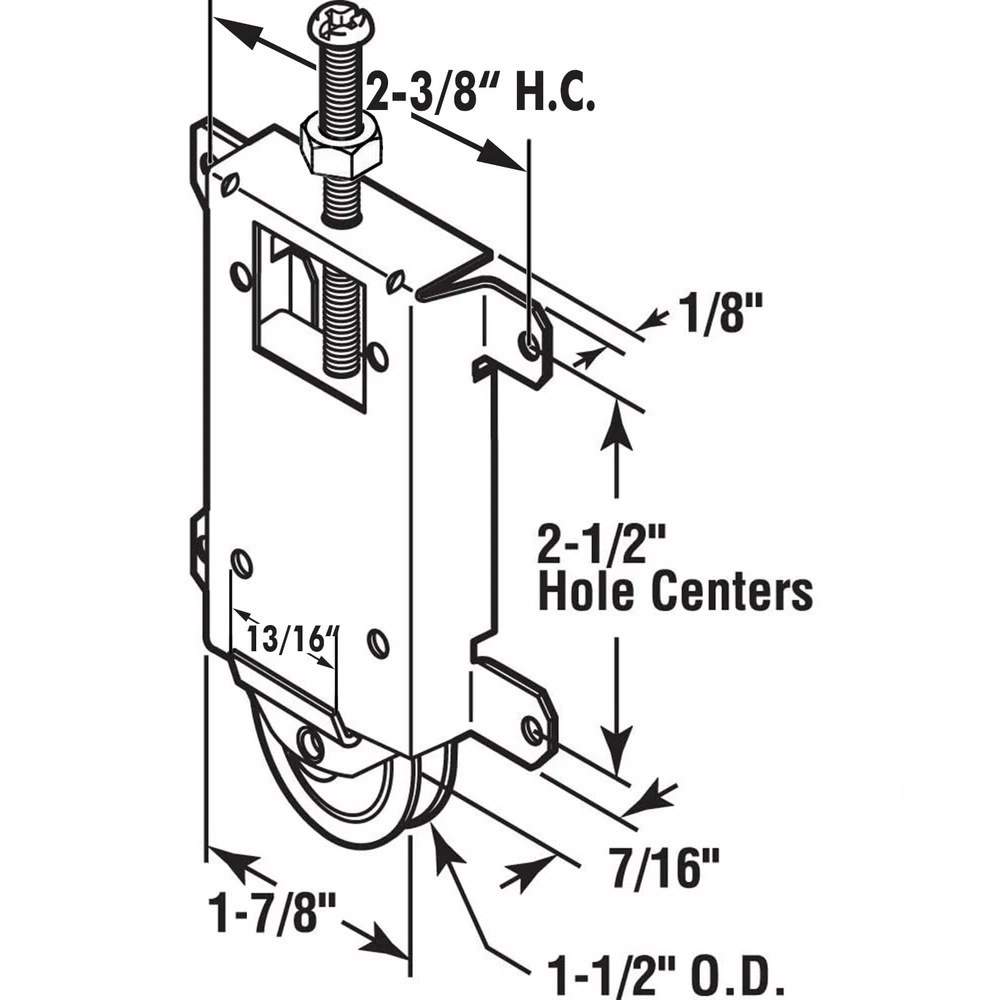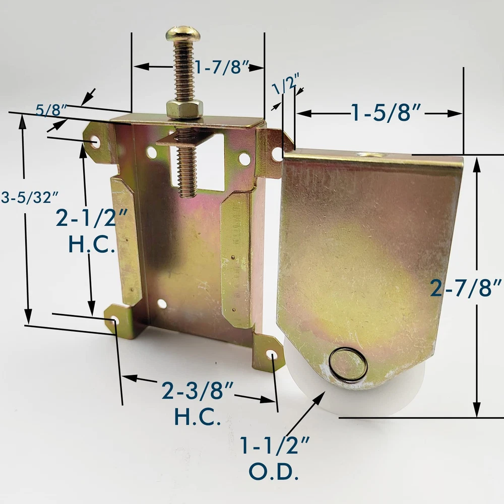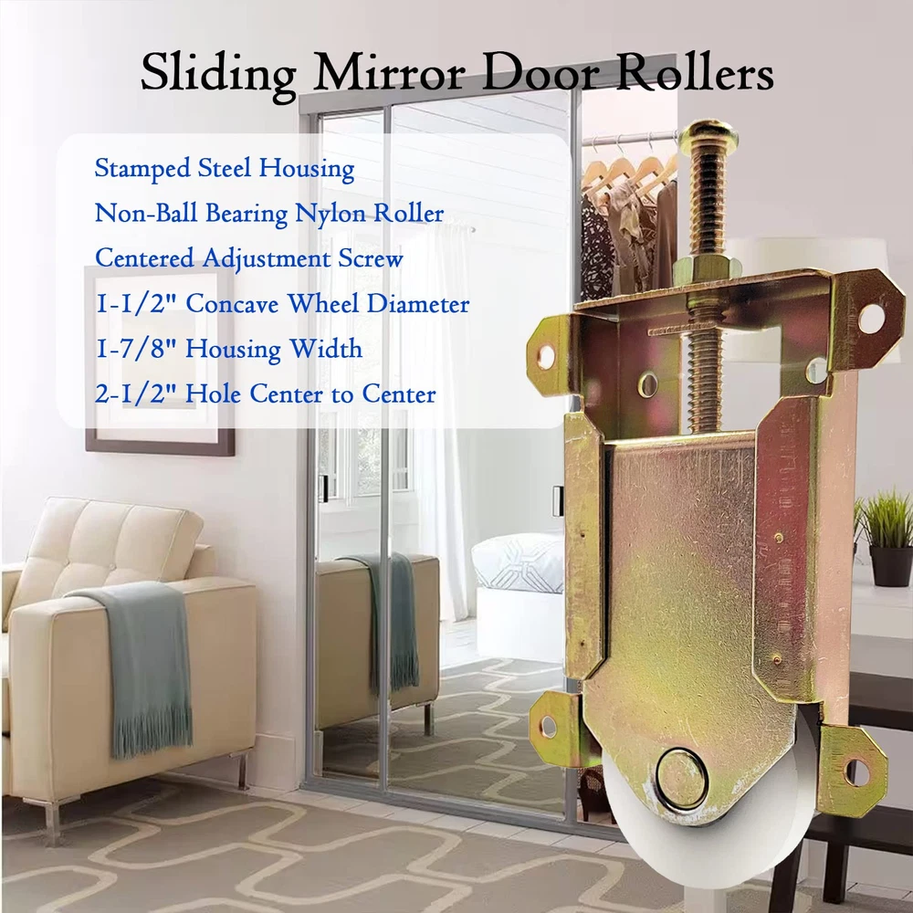 Replace Old or Damaged Rollers: Commonly used by Contractors and a variety of sliding closet door manufacturers to replace rollers on wood or metal framed sliding mirror doors. Nylon Constructed Wheels: The wheel is constructed of durable plastic which provides for a smooth, long-lasting, quiet roll and it features a narrow concave edge. Top Adjustment Screw with Set Nut: This mirror door roller assembly mounts on the bottom of sliding mirrored closet doors, it's adjustable once installed, the top adjustment screw allows for quick adjustments with a Phillips head screwdriver and easily stop loosing with a set nut. Separate Slot-in Wheel Design: Stamped steel housing has a 1-7/8 inch width and 2-1/2 inch hole centers. Separate slot-in metal bracket is 1-5/8 inch wide and 1/2 inch thick, which should be slid into your old roller housing in most cases. For further dimensional information, please see the line drawing. Package Includes: Includes 2 pack of sliding mirror door rollers, we recommend replacing both rollers at the same time. Bolts NOT included, please kindly keep the existing ones, since you don't want single wrong to penerate and break your mirrors!