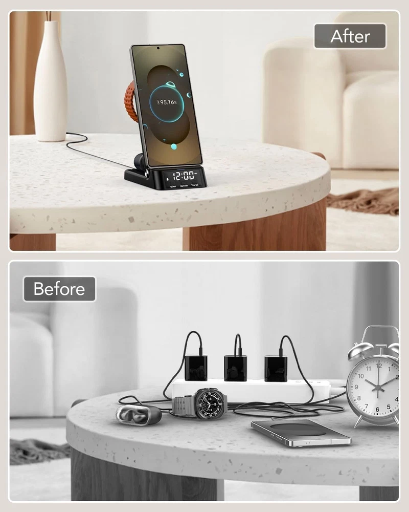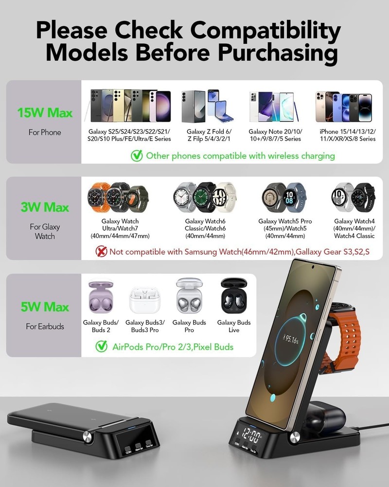 Elegant Wireless Charger with Digital Clock - 4-in-1 for Samsung Galaxy Series ‹ › ‹ › ‹ › ‹ › ‹ › ‹ › ‹ › ‹ › ‹ › Elegant Wireless Charger with Digital Clock - 4-in-1 Wireless Charger Compatible for Samsung Galaxy Series Features: Compatibility: Designed specifically for Samsung Galaxy Phones including S25/Edge/Ultra and Note 20, among others; Galaxy Watch 8 series; and Galaxy Buds 3/2. 12/24 Hour Digital Clock: Equipped with an LED digital clock for time management, featuring a convenient alarm function. Safe and Fast Charging: Intelligent protection technology ensures your devices are charged swiftly and securely, with features such as temperature control, over-voltage protection, and short-circuit protection. Travel-Friendly: Its foldable 4-in-1 design makes it an ideal travel companion, fitting seamlessly into your bag without taking up space. Comprehensive Package: Includes 4 in 1 Wireless Charging Stand, Type-C Power Cable, Charging Adapter, and User Guide. One-Year Friendly After-Sales Service: Offers peace of mind with potential replacements or refunds in case of quality issues. Benefits: Streamline your charging routine with the all-in-one design. Stay on schedule with the integrated digital clock and alarm. Safeguard your devices from potential hazards while charging. Perfect for home or travel - convenience without compromise. Enjoy a sense of security with our one-year after-sales support. Why Select Our Elegant Wireless Charger? Embrace the luxury of seamless charging with our Elegant Wireless Charger featuring a built-in digital clock. It not only provides a sophisticated solution for all your Samsung devices but also serves as a stylish accessory for any modern home or travel setup. With safety technologies ensuring the protection of your cherished devices and the convenience of a portable design, this charger is the epitome of elegance and functionality. Don’t settle for ordinary. Elevate your charging experience and enjoy the convenience it brings - order your Elegant Wireless Charger today! Shipping Free & Fast Shipping - We offer free shipping to most of the USA with a normal delivery time of 3-10 businessdays. However, due to various situations, additional delivery time (up to 3 weeks) may be required for some items. Alternative Carriers - We may use alternative carriers (e.g. USPS, FedEx, UPS, etc.) to ensure your package arrives safely and on time. Due to the use of multiple carriers, we are unable to provide a tracking number automatically. Handling Time - Orders are processed and shipped within 1-5 business days of receiving cleared payment. Shipping Restrictions - Shipping to Alaska, Hawaii, Puerto Rico, Guam, and other US territories may incur shipping charges or delivery restrictions. Please contact us before ordering, or your order can be refunded/cancelled. State Restrictions - There may be restrictions based on your state of purchase. For example, certain items may not be shipped to California due to state regulations. Contact for Tracking Updates - If you require tracking updates or have any concerns about the delivery of your order, please feel free to contact us, and we will be happy to assist you. Return Please see our ebay return policy. We do not accept return on most products. This is to avoid customers mis-using ebay returns. All sales are final. Please be sure to check the return policy listed at the top of the listing. In rare cases, we may accept returns, if the buyer pays both ways shipping and 20% restocking fee. If you are un-sure of return policy of a particular item, please ask before buying. Payment We accept all major credit cards, PayPal, and Apple Pay for your convenience. Your payment information is secure and encrypted to ensure a safe and seamless transaction. Please complete your payment within 3 days of purchase to avoid any delays in shipping. Feedback Your feedback is extremely important to us. We strive to provide the best products and customer service possible. If you are satisfied with your purchase, please take a moment to leave us a positive review. If you have any concerns or issues with your order, please contact us before leaving negative feedback. We are committed to resolving any problems and ensuring your satisfaction. Contact Us If you have any questions or concerns, please feel free to reach out to our customer support team. You can contact us through the eBay messaging system. We are available Monday to Friday, 9:00 am to 5:00 pm EST, and we will do our best to respond to your inquiry within 24 hours. Buy it now and enjoy a pleasant shopping experience! UPC: Not Set Item Length: Not Set Product Line: Not Set Unit Quantity: 1 Features: Alarm,Wireless Charging,Alarm Clock,Digital Clock,LED Charging Indicator,Foldable Design,Fast Charging,12/24 Hour Display,Portable,Compact Design Theme: Not Set Room: Bedroom,Home Office/Study,Kitchen,Living Room,Utility/Laundry Room Material: Plastic Character: Not Set Smart Home Protocol: Not Set Smart Home Compatibility: Not Set Brand: Unbranded Type: Wireless Charger Display Type: Digital Color: Black Movement: Not Set Power Source: Electrical Style: Not Set Finish: Not Set Character Family: Not Set Era: Not Set MPN: Not Set Model: Not Set Frame Material: Not Set Shape: Not Set Manufacturer Warranty: Not Set Protection Plan: No Coverage Item Height: Not Set Item Weight: Less Than 1 lb Item Width: Not Set Number Type: Not Set Original/Reproduction: Not Set Engraved: Not Set