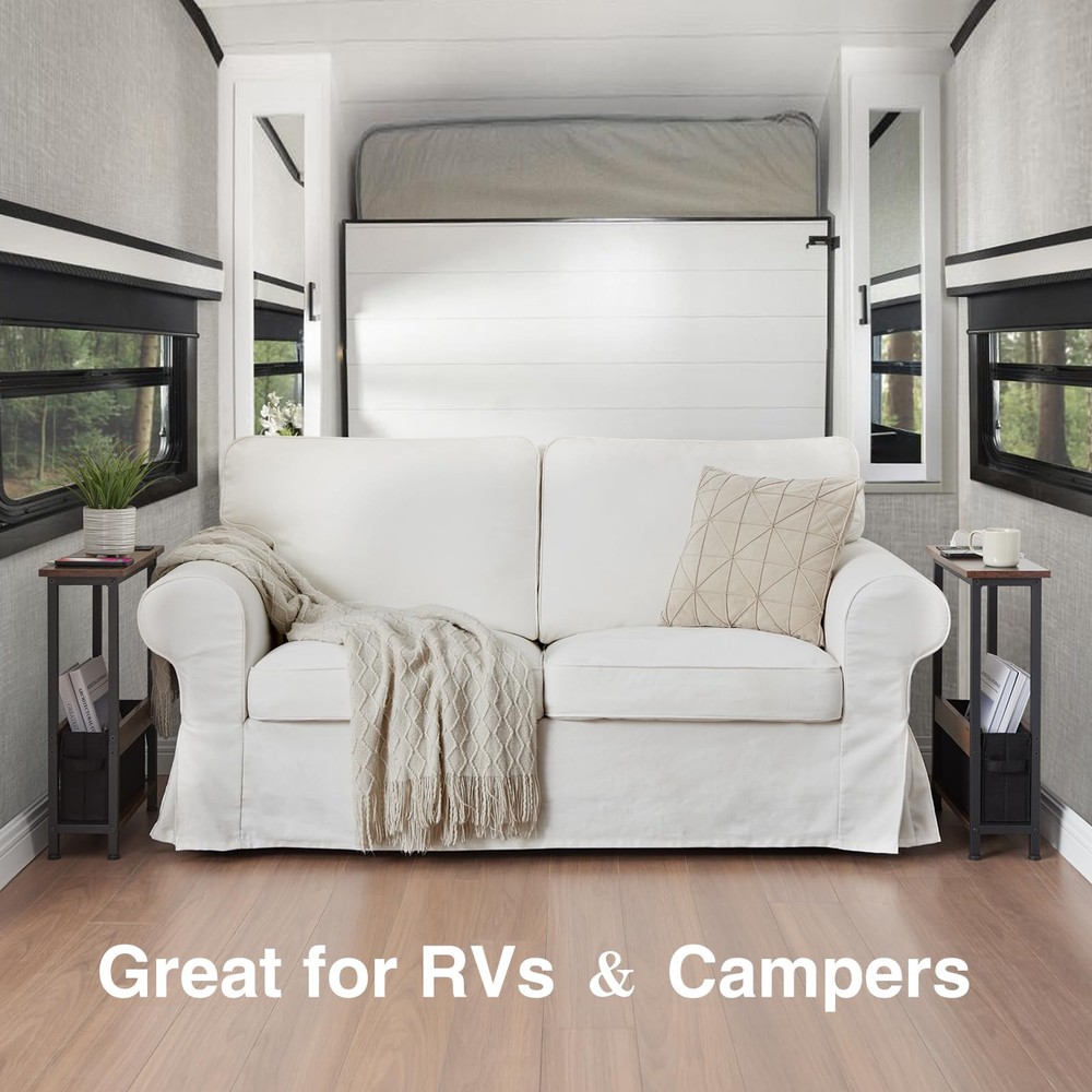 FEATURES: Charging Station Metal Frame Storage Fabric Drawer Adjustable Feet Space Saving Magazine Rack SPECIFICATIONS: Color: Rustic Brown Product Size: 7.1”W x 19”D x 24.7”H Fabric Drawer: 4.5"W × 15.7"D × 8"H Product Weight: 11 lbs PACKAGE CONTENTS: 1 x Small Side Table with USB Ports and Power Outlets 2 x Assembly Tool 1 x Hardware Pack 1 x Assembly Instruction Fit In Narrow Small Spaces: This small side table takes up a small footprint, it is the perfect height and size to fit in the narrow spaces next to your bed, couch, sofa chair, recliner Add More Storage Space: When you're sitting on the couch in living room but only have a limited space, this side table with storage drawer and magazine holder rack is skinny and can hold your drink, coffee cup or tv remote perfectly, the storage fabric drawer on the bottom is holding books, magazines and newspaper End Table with USB Ports and Outlets: Whether it's a bedside nightstand or a side table, the charging station with 2 outlets and 2 USB ports on the top makes it easy to charge your phones or other devices without getting off couch, bed. The cord length is 4.9 feet. NOTE: We have optimized the charging settings of the usb port and will no longer have the issue of some phones being unable to charge. Please refer to the image for details Thin But Sturdy Side Table: This skinny table is heavy enough to ensure stability, it's weighted so it will not easily tip over just casually bumping into it.It also has adjustable feet on the bottom so you can level the table on most any uneven floor Easy To Put Together: All parts are well labeled and all tools you need are included, the instruction is also clear and easy-to follow, installation won't take you too long