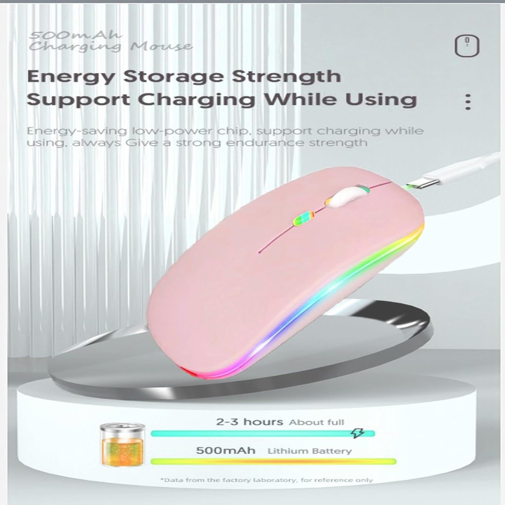 Wireless Bluetooth Mouse,LED Dual Mode Rechargeable Silent Slim Laptop pink Product Details Package Dimensions: 4.92 x 2.99 x 1.26 inches Item Weight: 2.89 ounces Manufacturer: guiheng Brand: Guiheng Color: pink Connectivity Technology: Bluetooth Special Feature: Lightweight Movement Detection Technology: Optical Dual Mode Wireless Bluetooth Mouse: 7 different color changes randomly while in use, offering soothing lighting, creating cool and fancy atmosphere for work and play. This Wireless Bluetooth Mouse is Suitable For With Laptops/PC/Notebook/Tablet/Macbook/ipad/iPhone. It is Compatible With Android/Chromebook/Windows/Vista/Linux/Notebook/Mac OS and Other Devices. Suitable for Homes、Offices、Travel and More. Wireless Computer Mouse Advanced Optical Tracking Technology with Quick Click and Precise Responsiveness Control, Can Meet Your Demand of Daily Office Work inGames and Personal Preference,; The mouse will be in sleep mode in 5 mins of inactivity. You can choose use the 2.4G wireless mouse when the mouse botton switch is on the 2.4G mode,or connect your laptop's Bluetooth to use the Bluetooth mouse, easy to switch, it can be easily put into your laptop bag and ultra-space saving.Slim and lightweight,durable ergonomic mouse is perfect for travel.The USB receiver is stored inside the back of the mouse.No need for a driver,Plug and Play!Automatic sleep mode and wake-up mode are installed to save energy. Colorful LED rechargeable dual-mode Bluetooth mouse (Bluetooth 5.2+USB 2.4G) Note: Cannot be set to a specific color. One mouse, multiple devices Just press the mode switch button at the bottom of the mouse to control the device you want. Wide Device Compatibility Windows 8, Windows 10 or later, Android 5.0 or later, Mac OS X10.10 or later, iPad OS 13 or later, Chrome OSTM.