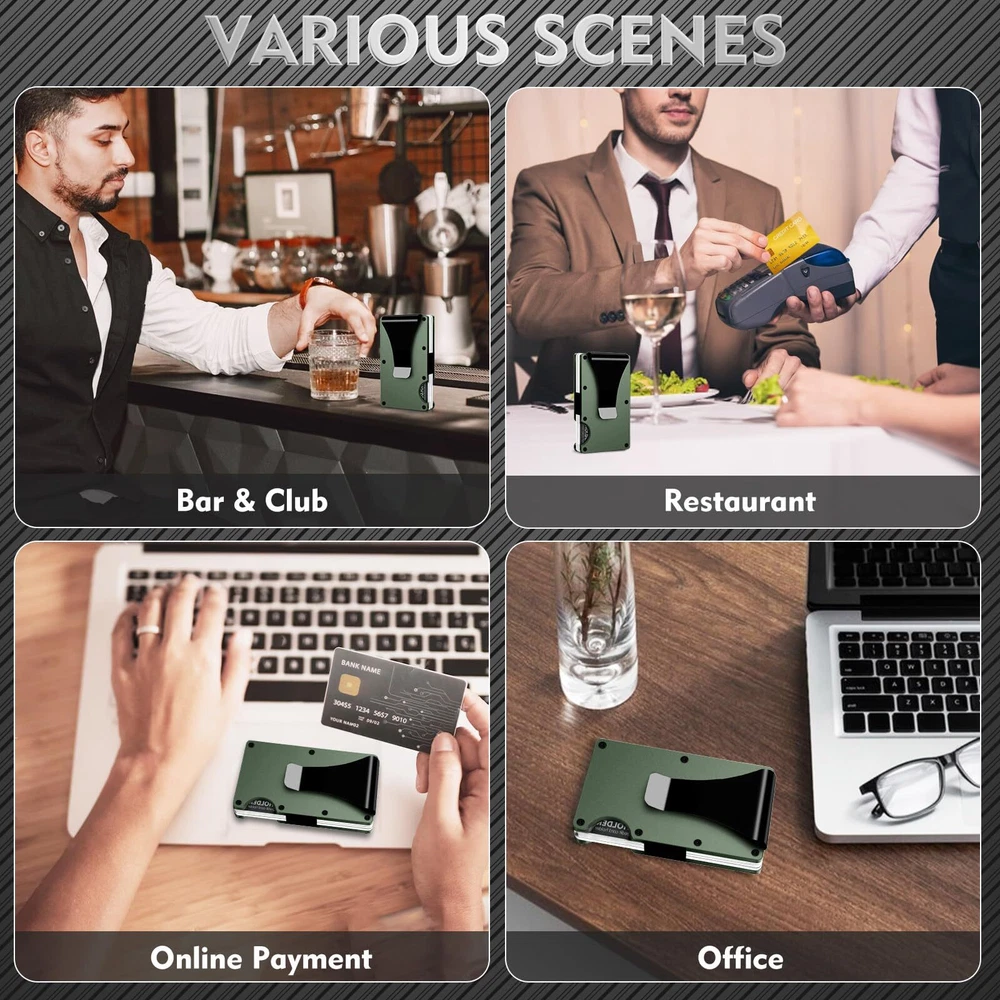 【Minimalist Design】This mens minimalist wallet features an ultra-thin, ergonomic and lightweight design, giving you a slim and comfortable feel. It can be easily tucked into almost any pocket and can even hold up to 12 cards and 8 cash without feeling bulky. It's time to ditch your bulky wallet forever. 【Information Security】Our men's metal wallet has been upgraded with in-built RFID blocking technology to effectively prevent thieves from scanning and accessing your cards in your wallet, ensuring the security of your personal and financial information at any time. 【Superior Material】The credit card wallet for men is crafted from premium aluminium and stainless steel material with rustproof process for the surface to resist rust, fading and scratching, built-in high-stretch elasticated band is durable and easy for you to access your cards. 【Functionality and Convenience】This is a compact wallet for men with a perfect combination of functionality and convenience. It can hold more than ten cards, and the aluminium clip can organise bills and cash, meeting your necessary cash and card needs on the go. In addition, the front pocket wallet is very simple to use, with the help of ultra-elastic bands you can easily insert and push out cards. 【Great Gentleman Accessory】With a practical money clip and modern metallic elements, this mens wallet is the great gentleman's accessory. Regardless of your ages, the stylish, elegant and sophisticated mens slim card wallet is absolutely an amazing gift for your friends, dad, grandpa, brothers, boyfriend, husband and so on.