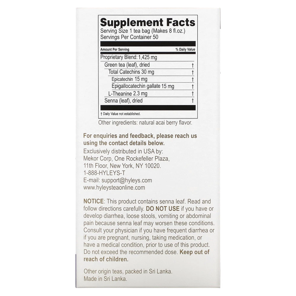 Drink Hot or Cold 100% Natural Product Herbal Supplement Helps Promote Weight Loss* How It Works: 30 mg of catechins and 2.3 mg of L-Theanine per serving. Helps progressively lose weight by maintaining normal metabolism of fat and carbohydrates. Promotes healthy digestion and works as a gentle laxative for occasional irregularity. Green tea may reduce the risk of breast or prostate cancer although the FDA has concluded that there is very little scientific evidence for this claim. *To attain maximum benefit, it is important to maintain a healthy, balanced diet which is high in fiber, drink plenty of water, and exercise regularly. Our eBay Store About Us Contact Us Add to Favorite Sellers Supplement Facts Serving Size: 1 tea bag (Makes 8 fl oz) Serving Per Container: 50 Amount Per Serving %Daily Value Proprietary Blend: 1,425 mg Green tea (leaf), dried † Total Catechins 30 mg † Epicatechin 15 mg † Epigallocatechin gallate 15 mg † L-Theanine 2.3 mg † Senna (leaf), dried † †Daily Value not established. Expiration Date: 01/01/2027 Disclaimer: Our receiving department does its best to verify and then enter the correct expiration dates for all incoming products. However, discrepancies do occur from time to time. This being said, the exceptionally high turnover at iHerb ensures that our inventory is among the freshest in the industry. Hyleys Tea, Slim Tea, Acai Berry, 50 Foil Envelope Tea Bags, 2.64 oz (75 g) DESCRIPTION: Drink Hot or Cold 100% Natural Product Herbal Supplement Helps Promote Weight Loss* How It Works: 30 mg of catechins and 2.3 mg of L-Theanine per serving. Helps progressively lose weight by maintaining normal metabolism of fat and carbohydrates. Promotes healthy digestion and works as a gentle laxative for occasional irregularity. Green tea may reduce the risk of breast or prostate cancer although the FDA has concluded that there is very little scientific evidence for this claim. *To attain maximum benefit, it is important to maintain a healthy, balanced diet which is high in fiber, drink plenty of water, and exercise regularly. SUGGESTED USE: Drink 1 cup preferably after your last meal of the day. Do not exceed 3 cups in a 24-hour period. Hot Tea - Pour 8 fl oz of freshly boiled water in a cup over your tea bag. Cover and steep for 5-8 minutes. Gently squeeze the tea bag to release any remaining extract. Iced Tea - Prepare hot tea with 4 fl oz of water. Let it cool and pour into an ice-filled glass. The melting ice will dilute tea to serving strength. These steps directly influence the amount of beneficial components that end up in your cup. INGREDIENTS: Natural acai berry flavor. WARNINGS: This product contains senna leaf. Read and follow directions carefully. Do not use if you have or develop diarrhea, loose stools, vomiting or abdominal pain because senna leaf may worsen these conditions Consult your physician if you have frequent diarrhea or if you are pregnant, nursing, taking medication, or have a medical condition, prior to use of this product. Do not exceed the recommended dose. Keep out of reach of children. Store in a dry place with no odors.