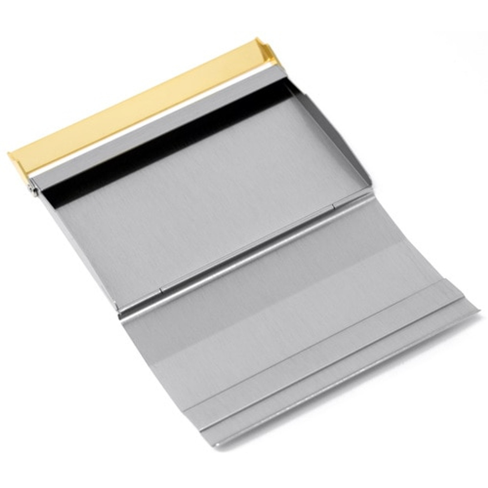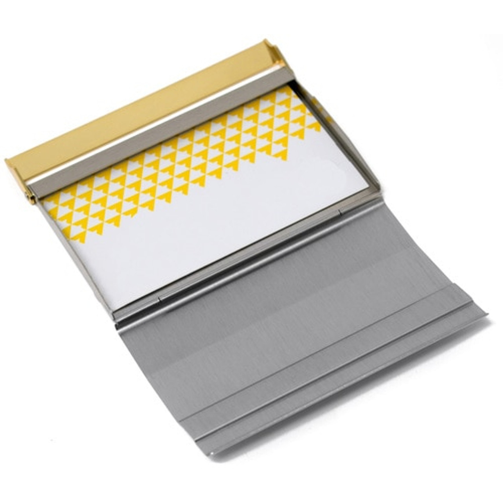 Keep your business cards safe with this unique business card holder that opens vertically and features a bar latch that keeps the card holder safely locked. Made of brushed stainless steel, they can hold between 1520 business cards, credit cards and ID cards. Offered in both Vertical and Horizontal models in Silver, Silver Gold and Gunmetal colors. Compact, pocketsized card holders can easily slip into your pocket, briefcase or purse. Stephanies large collection includes business card holders in leather, gold and silver metallic finishes. Please see our other business card listings for more options.