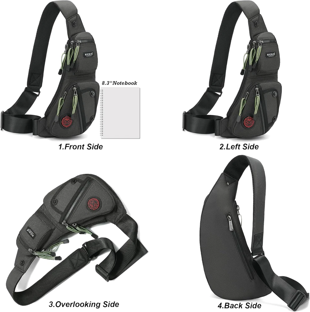 Material: This sling bag is well constructed of water-resistant nylon material. Lightweight, strong and sturdy. Not easy to be scratched. The size of it is bigger than a fanny pack, but not as big as a backpack. Unbalance Backpack Wearing Styles: It has great flexibility. You can use it both as chest pack and shoulder bag. Also it can be worn in the front or back of body. Multiple Storage Purpose Sling Bag: Large main compartment with inner open cellphone pouch is perfect for 8.3'' Tablet with cover, Small notebooks, Large cellphone. 4 front zippered pockets are great for various of small items. Sturdy: Good construction and strong and sturdy bag. Shoulder strap is adjustable to meet different requirements for both men and women. Also for plus size people. Versatile: It's for walking/traveling/biking/hiking/museums/theme parks and everyday using. Also it's a great gift for adult. Product Description Keep your hand free while you are walking, hiking or traveling. ✔ Gifts for women and men. ✔ Sturdy, hands-free, safe, comfortable. ✔ Multiple compartments capable of holding your phone, cash, cards plus a few other essentials, make all your valuables safe and well organized. Smart & Unique Design ✔ 1*main compartment with inside open pocket & zippered pocket ✔ 2*front pockets ✔ 1*front pocket on the top ✔ 1*back hidden pocket ✔ 1*adjustable padded shoulder strap STURDY AND WATER RESISTANT MATERIALS This sling chest bag is made of nylon. Top-quality zippers and durable shoulder strap. UNBELIEVABLE ORGANIZED 4 Zippered Compartments with one hidden anti-theft pocket in the bag to secure all your items. HIDDEN ANTI-THEFT POCKET Hidden anti-theft pocket is safe for protecting your valuable items inside when you are travelling or lining up. ADJUSTABLE SHOULDER STRAP The Shoulder Strap is easily adjustable with padded. It feels comfortable whether worn on the front, back, or cross body.