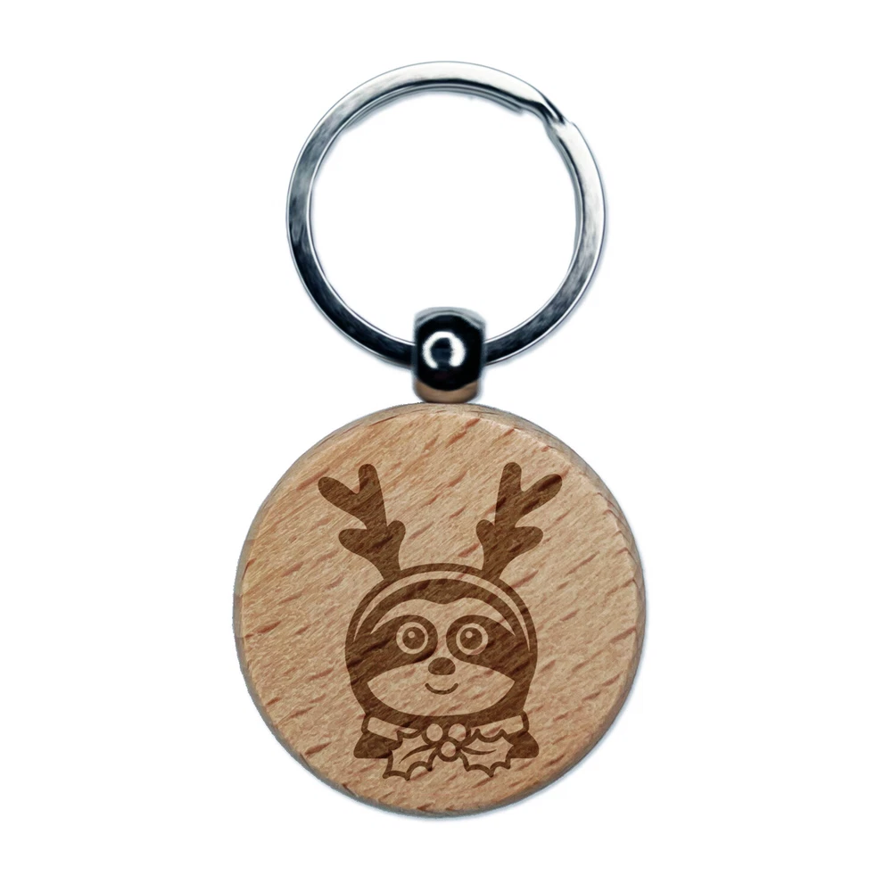 Sloth Reindeer Christmas Engraved Wood Round Keychain Tag Charm